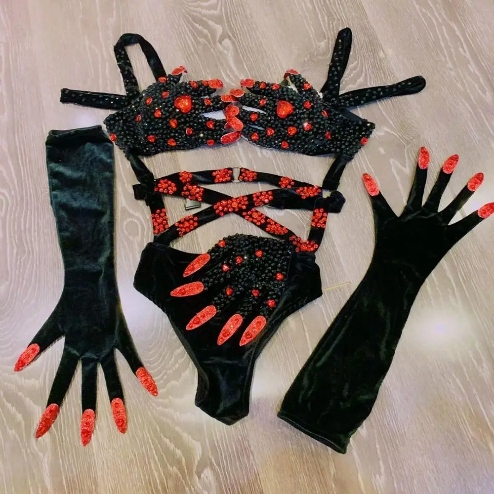 Черные стразы, бандаж, бикини, боди, кристаллы, перчатки, сексуальная одежда для сцены, вечерние костюмы для ночного клуба, DJ Pole, Одежда для танцев
