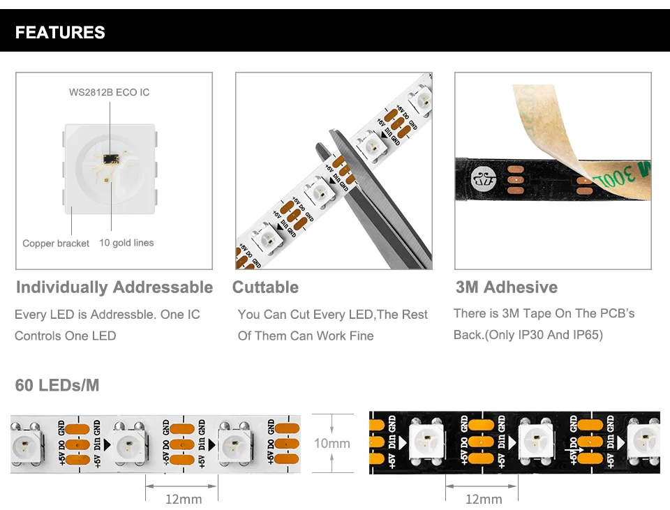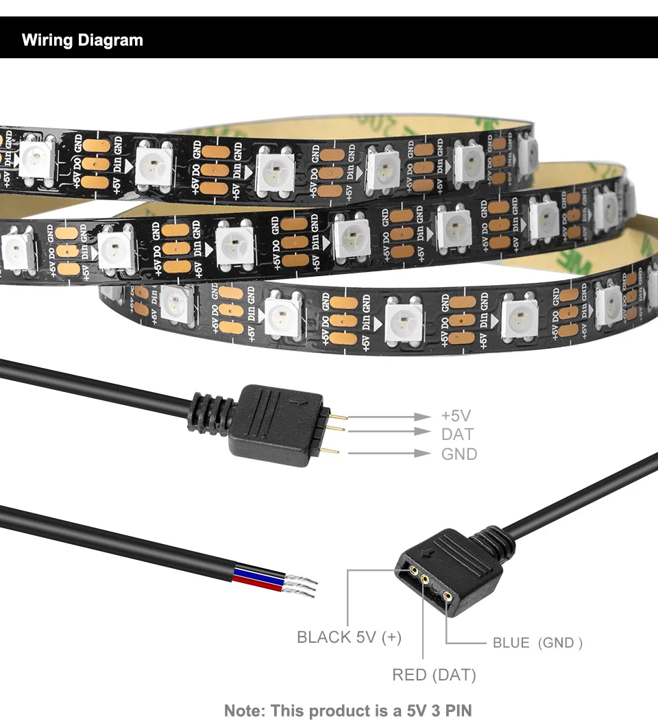 Примечание:Эти адресуемые светодиодный ленты предназначены только для 3 pin + 5V ADD_Header (+ 5V,DATA,N/A,GND). Спецификация:Светильник источник: 5050 RGB светодиодный.IC Модель: WS2812BСветодиодный Кол-во: 60 шт. на светодиодный индикатор.Угол обзора: 120 °.Напряжение: 5 В постоянного тока.Макс Мощность: 0,3 W/светодиодный.Водонепроницаемый: IP30 не водонепроницаемый.Цвет платы FPCB: черный/белыйРабочая среда: от-40 ℃ до + 80 ℃Определение штифта: + 5 В, D, N/A, GNDКрасный провод: 5 В +/зеленый провод: данные/белый провод: GNDСветодиодный ремешок: 50 смКабель подключения материнской платы: 30 см Посылка:1 * адресуемые RGB светодиодный полосы с материнской платой соединительный кабель.