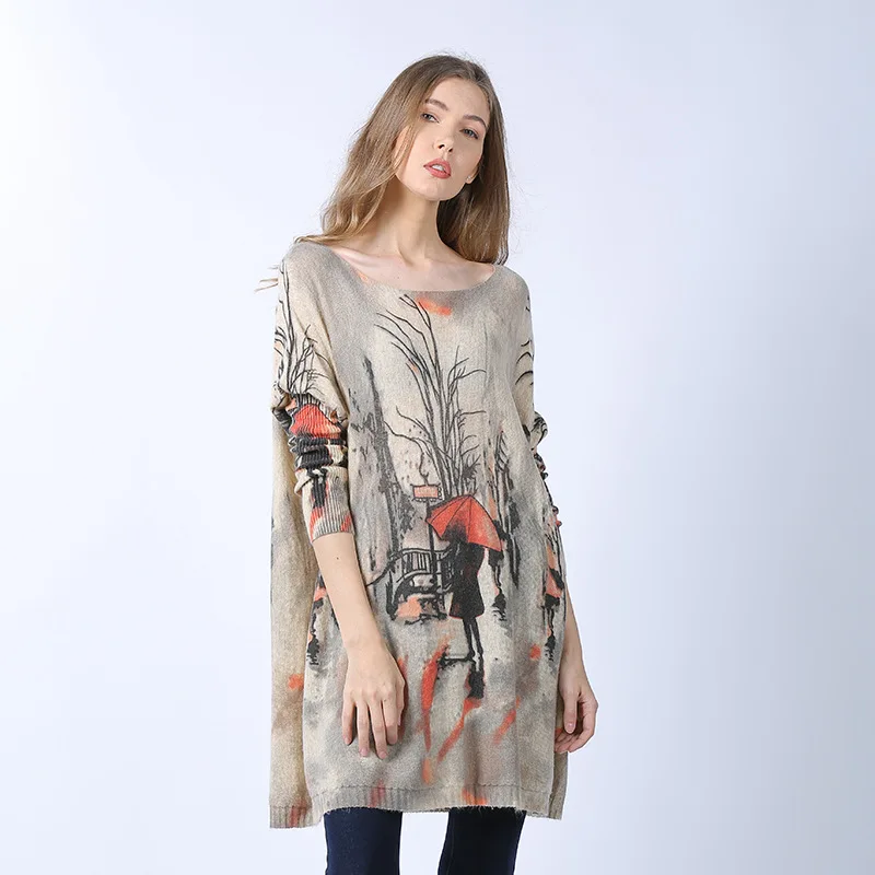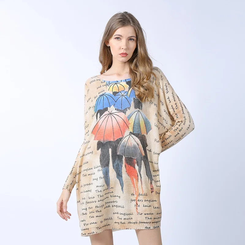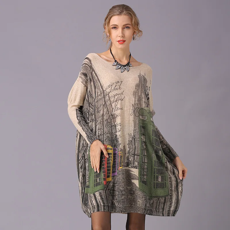 Женское трикотажное платье-свитер, с длинным рукавом летучая мышь, с принтом, большого размера, 2021