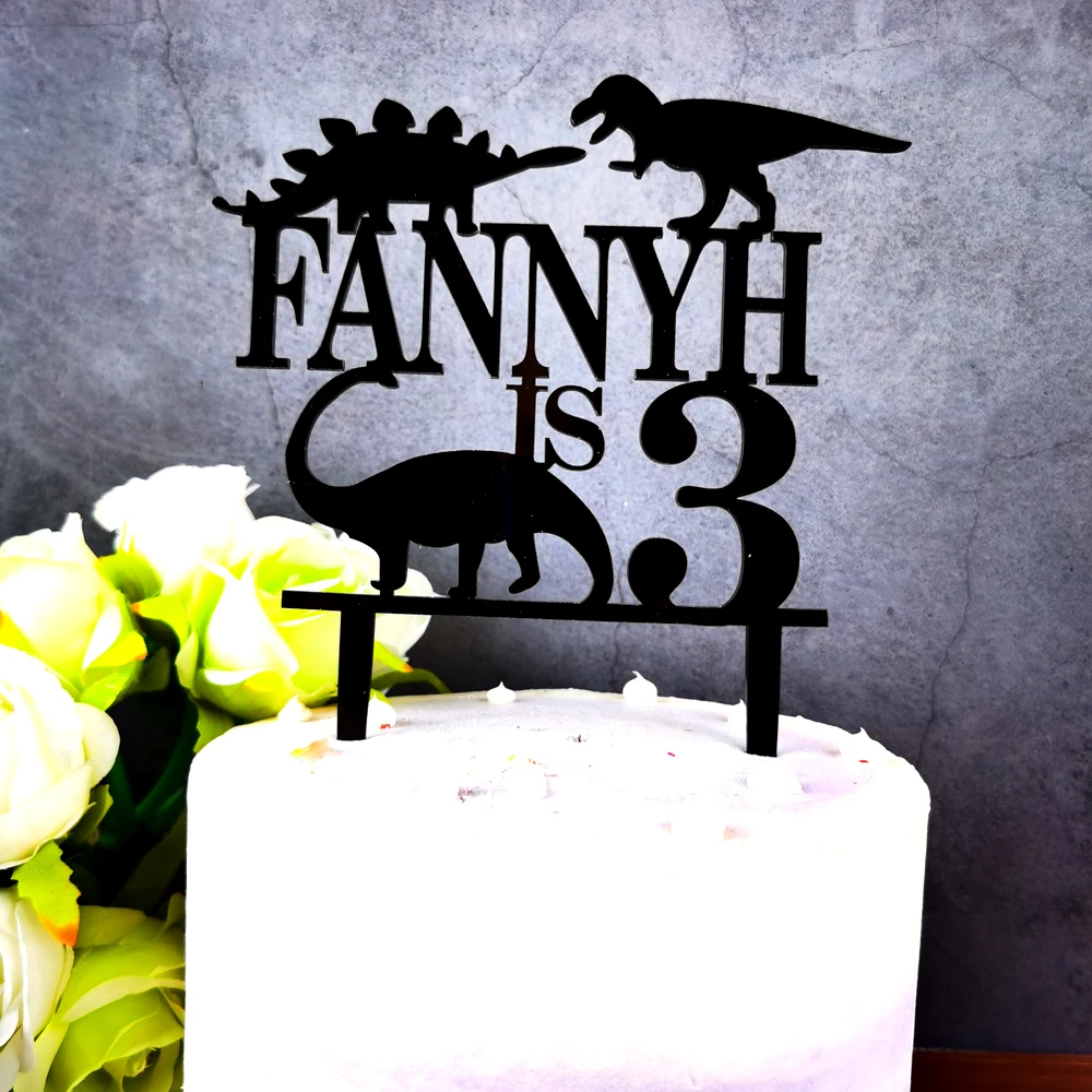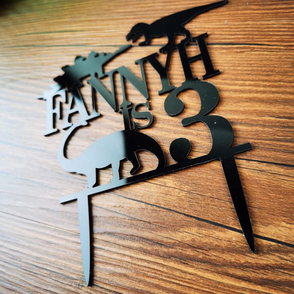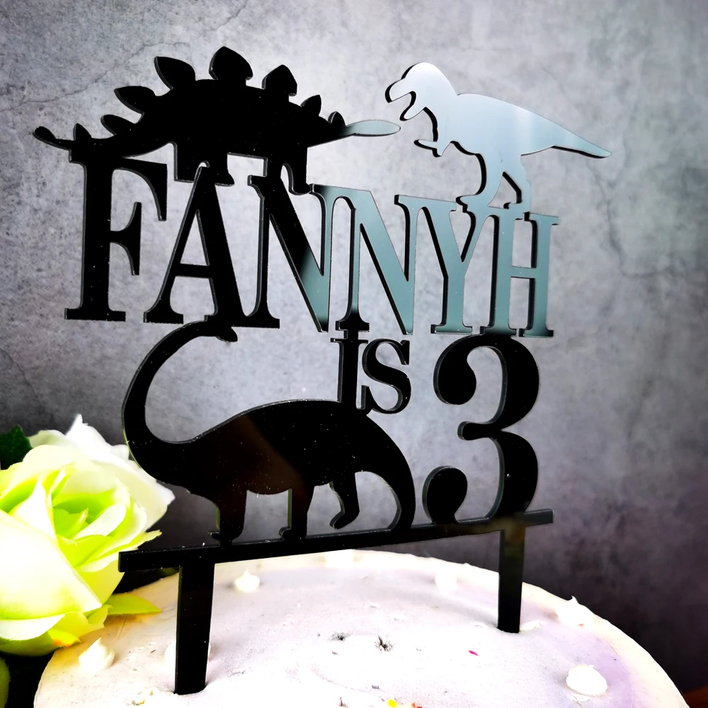 Топпер для торта на день рождения с именем и возрастом динозавра, акриловый персонализированный черный, блестящий золотой и зеркальный Золотой украшения для вечеринки, дня рождения
