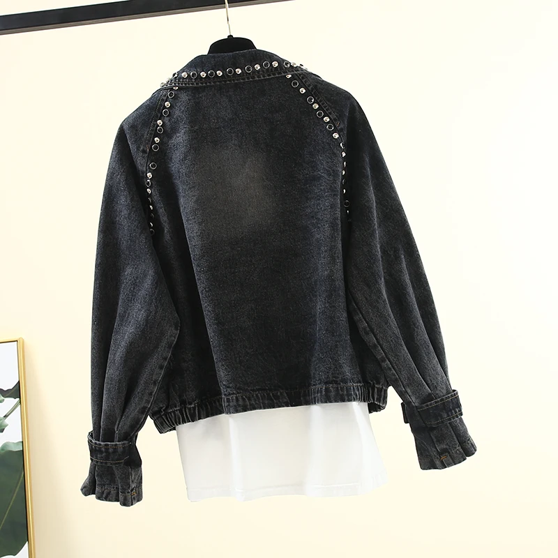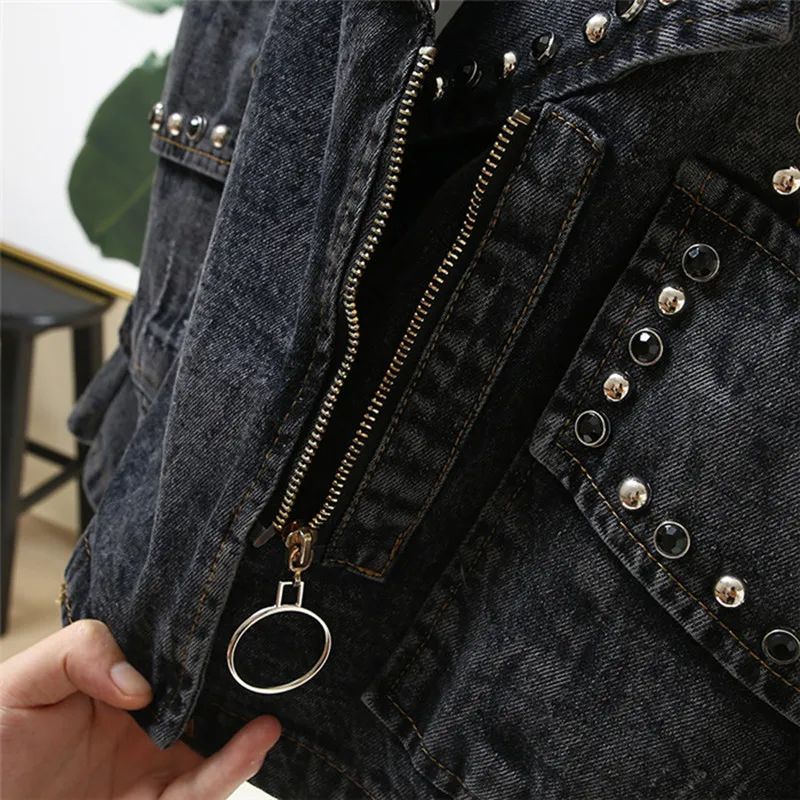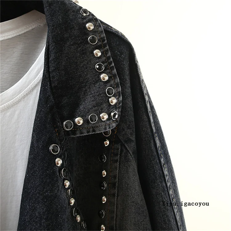 Повседневная джинсовая куртка в стиле Харадзюку с заклепками, повседневное женское джинсовое пальто в стиле бойфренда, винтажная свободная черная джинсовая куртка, уличная одежда