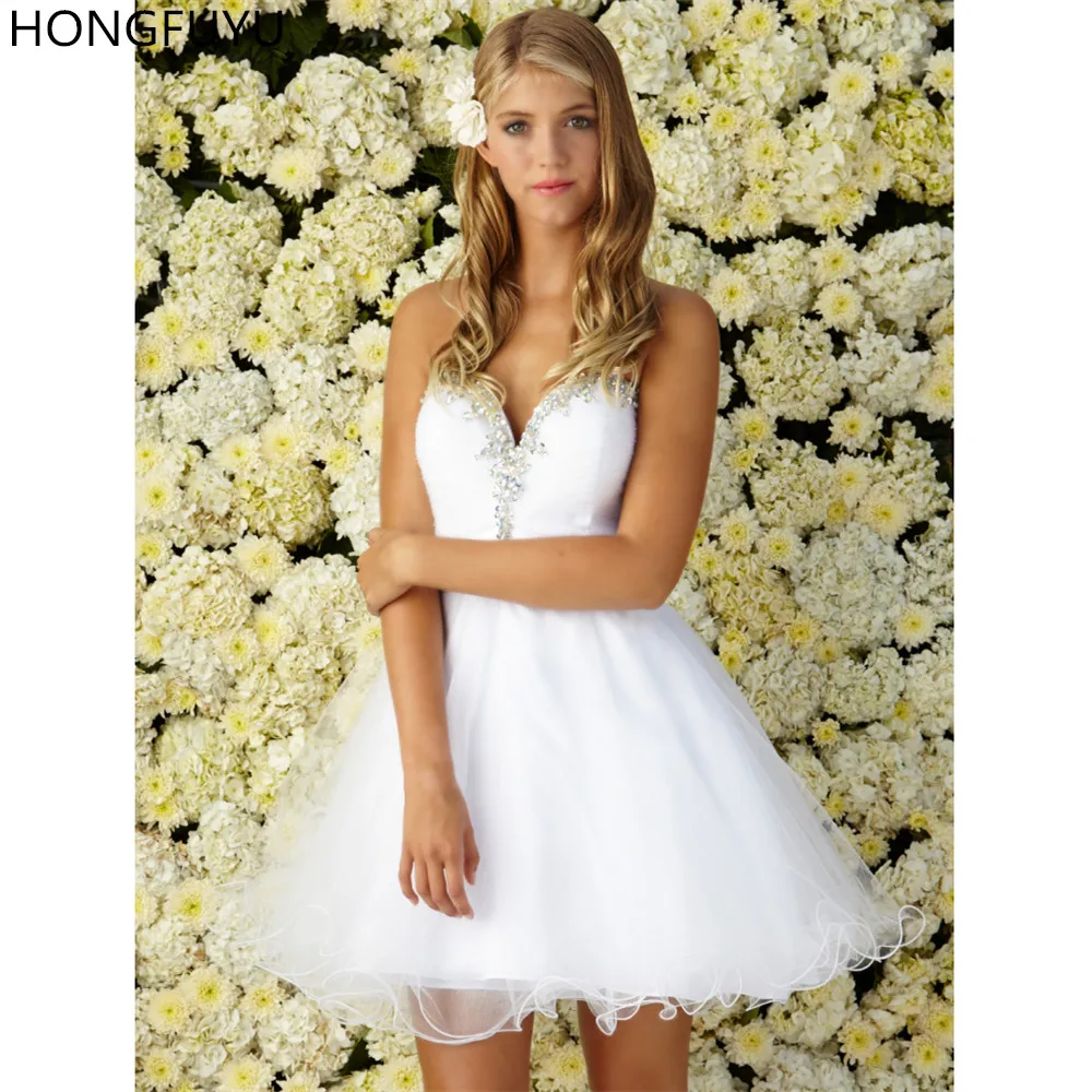 Сверкающие коктейльные платья HONGFUYU со стразами для встречи выпускниковкорпоратива, короткие белые трапециевидные платья из тюля для выпускного вечера