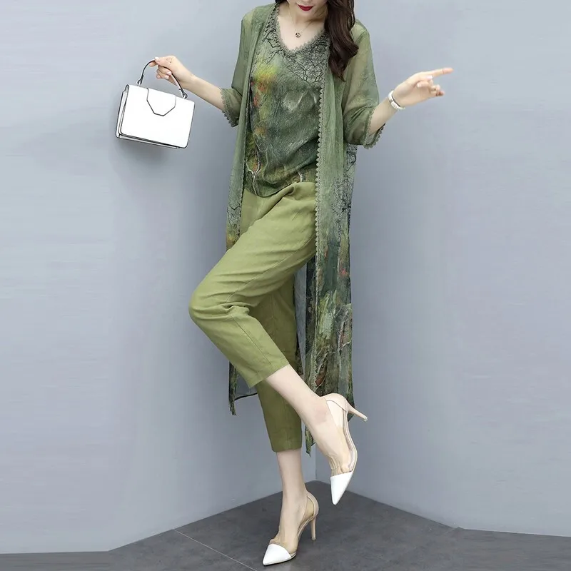 Женский костюм, весна-лето 2020, элегантный винтажный брючный костюм с принтом в стиле бохо, комплект из трех предметов со штанами, Женская Повседневная шикарная одежда размера плюс