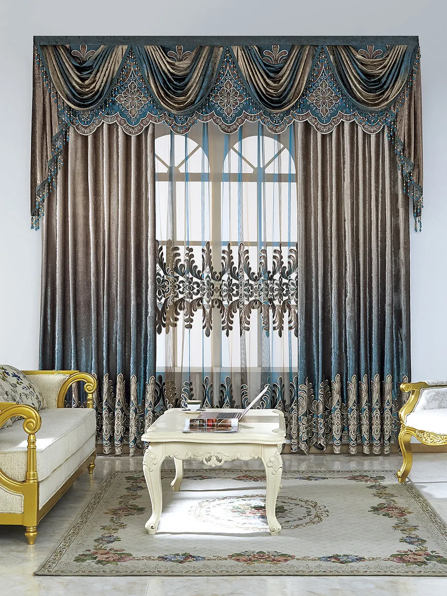 Комплект штор, европейская роскошная занавеска С Балдахином для гостиной, комплект занавесок бронзового синего цвета, готовая занавеска 051