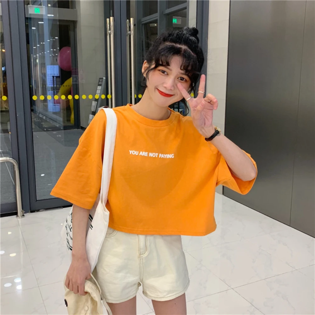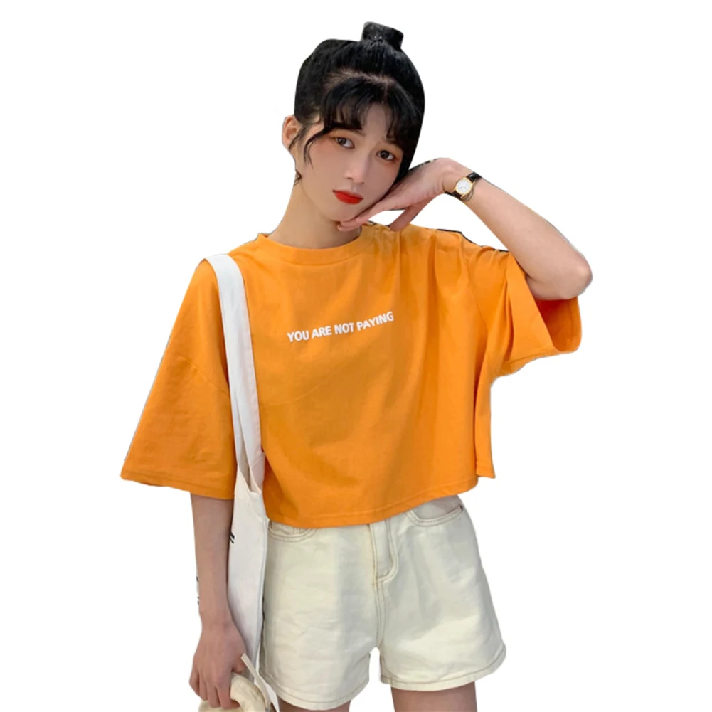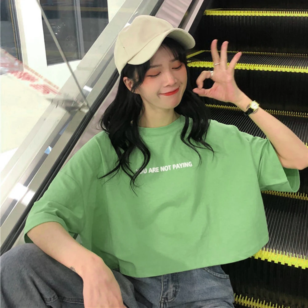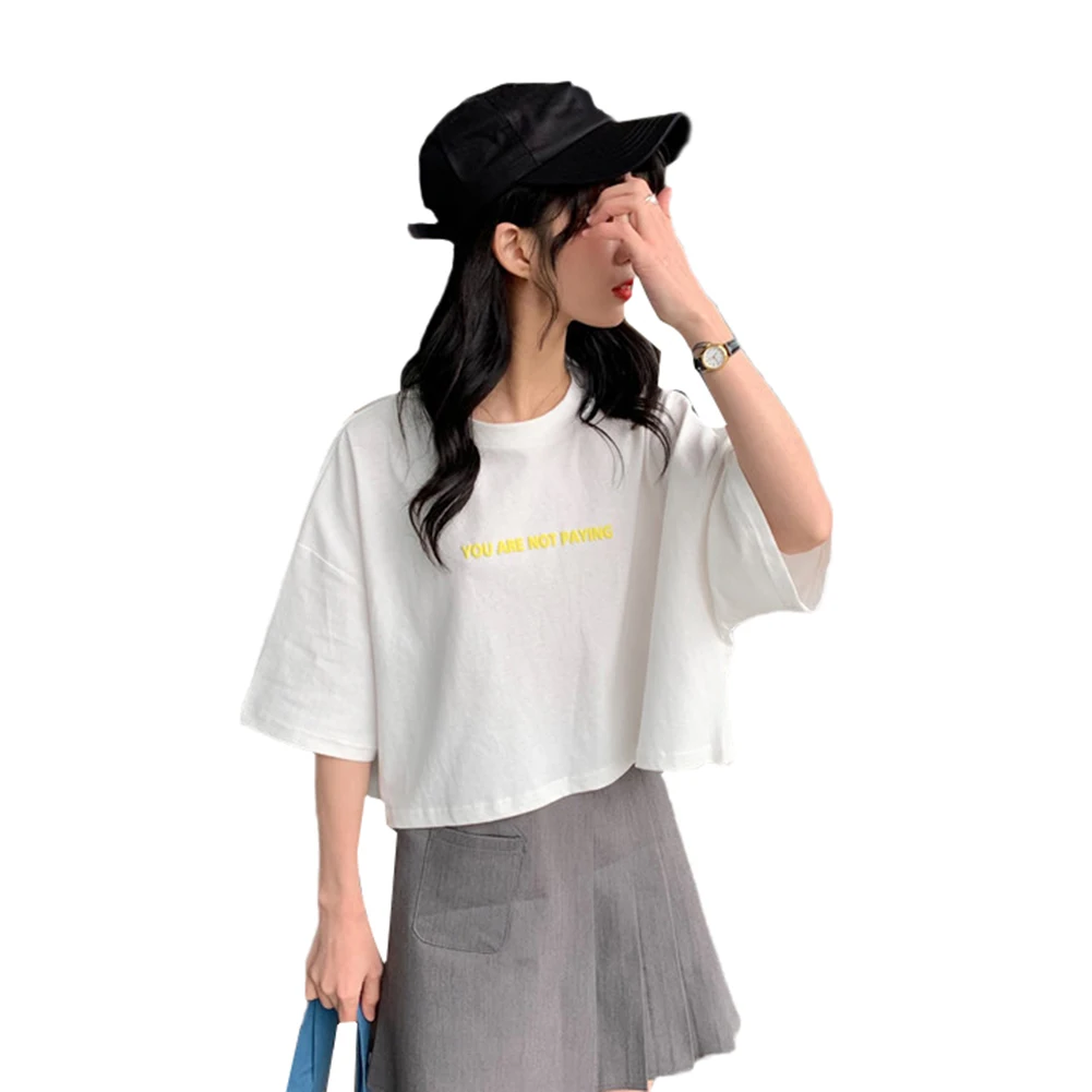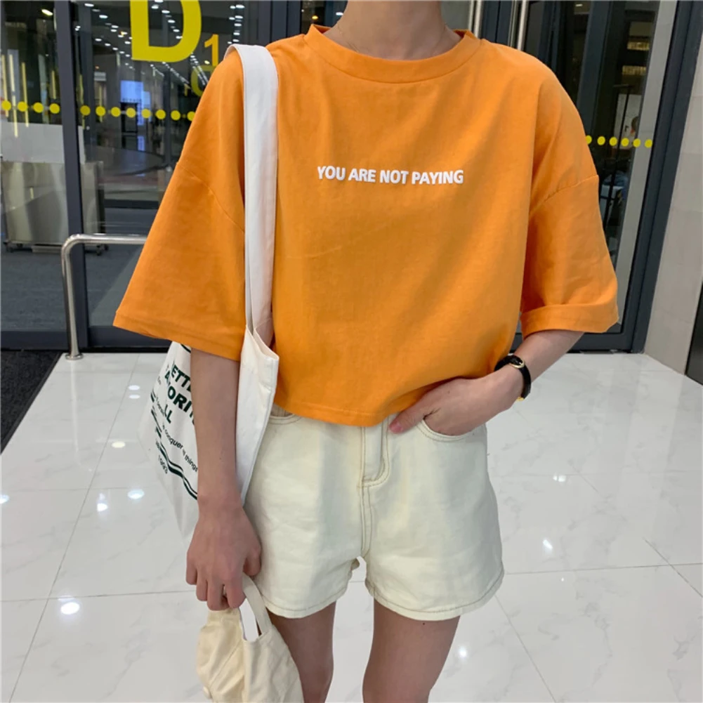 Корейская стильная футболка с круглым вырезом и рукавом до локтя, Женская Повседневная Свободная летняя футболка, топ для девушек