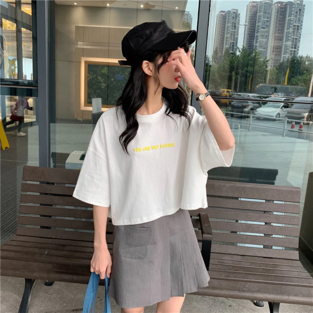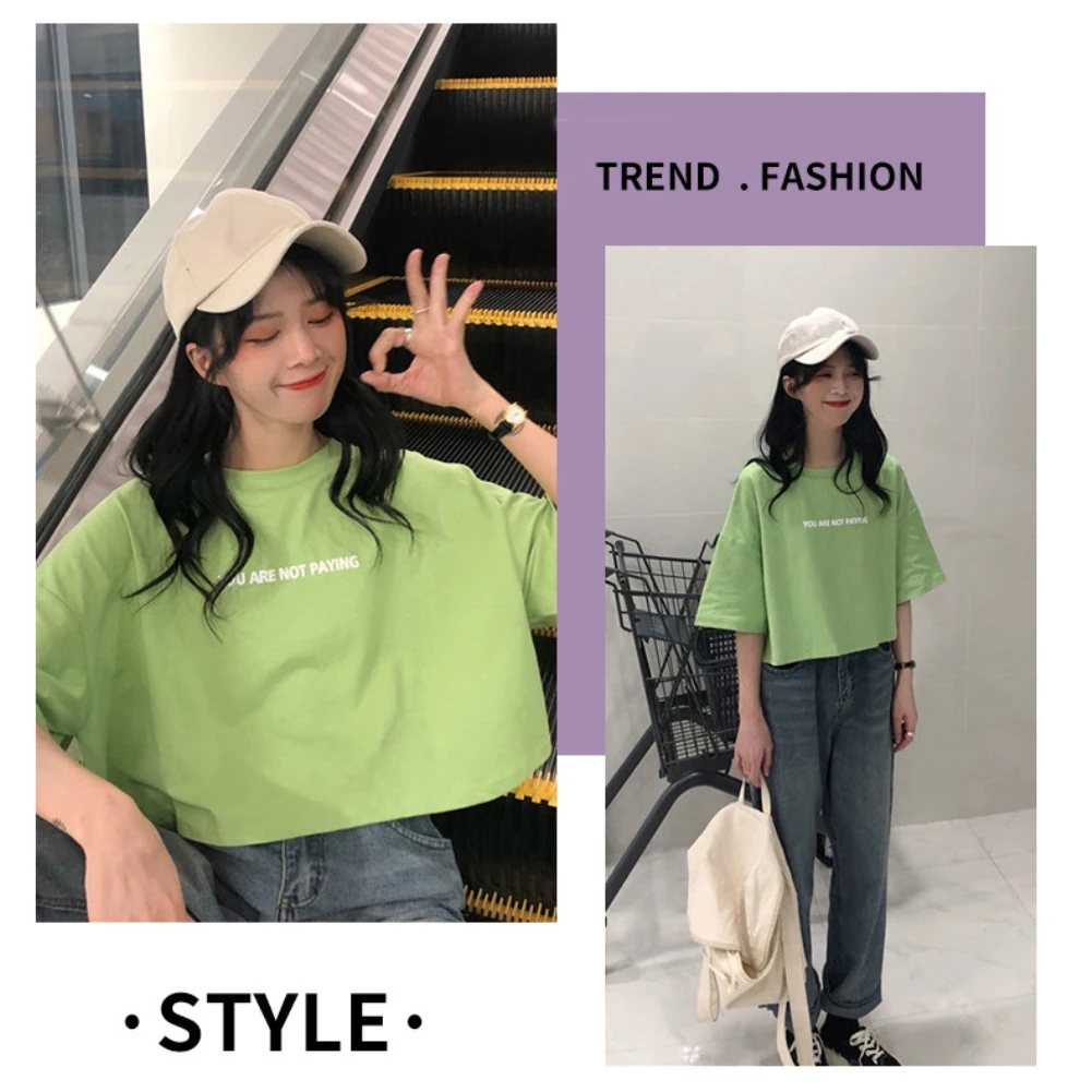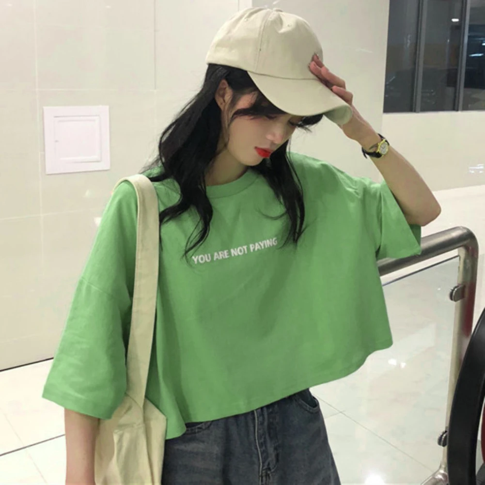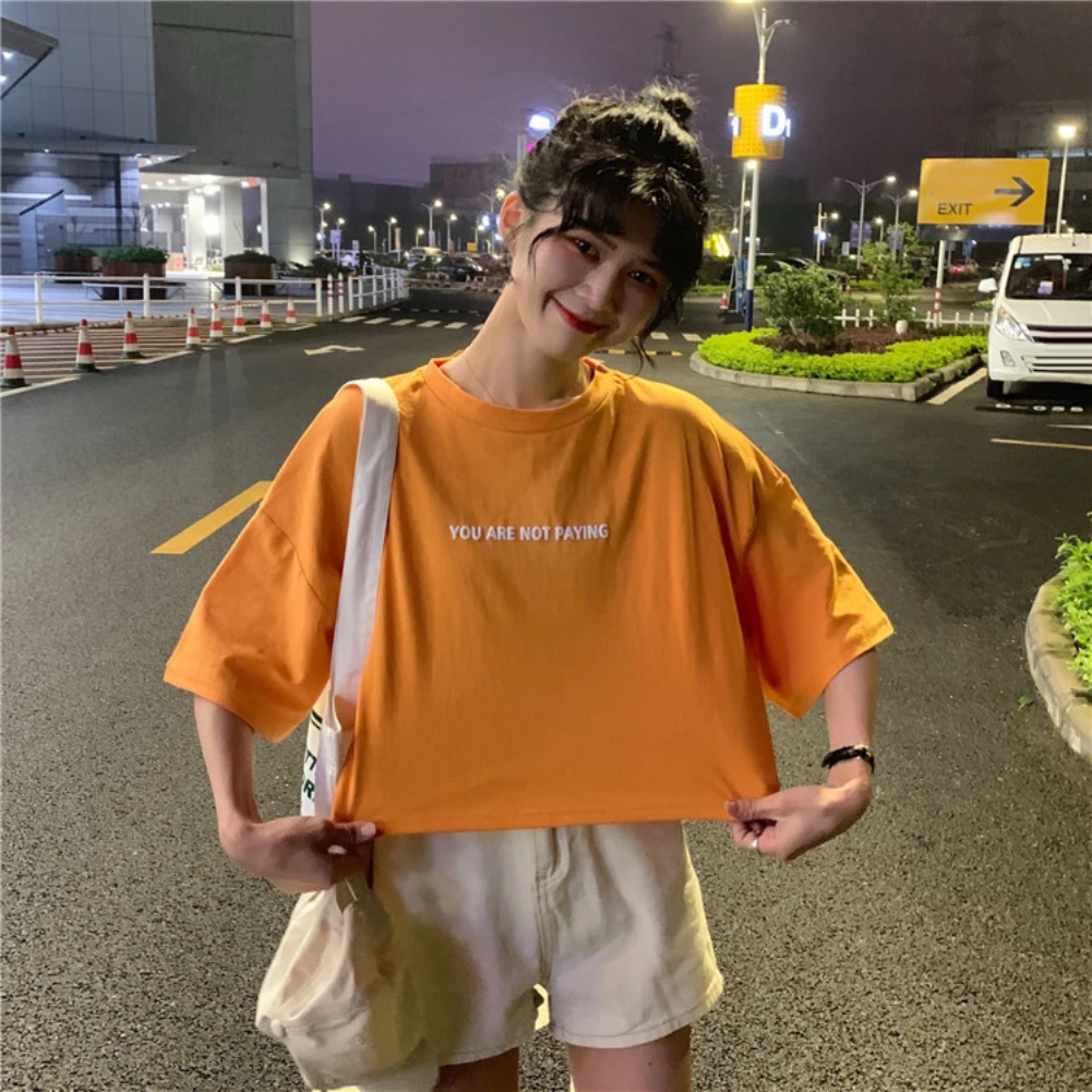 Корейская стильная футболка с круглым вырезом и рукавом до локтя, Женская Повседневная Свободная летняя футболка, топ для девушек