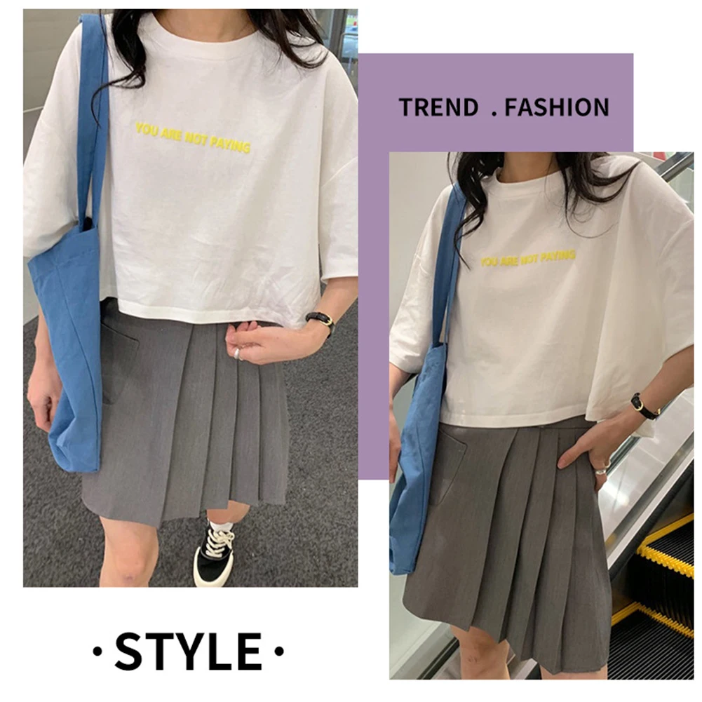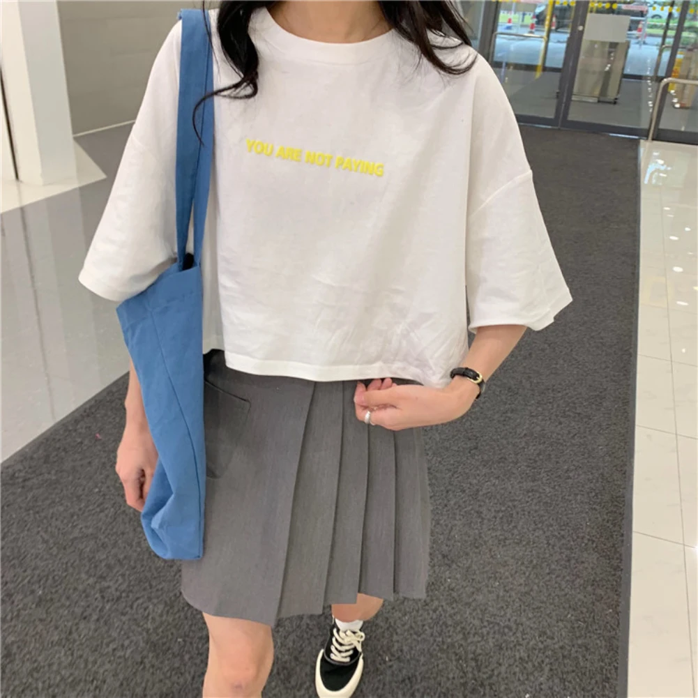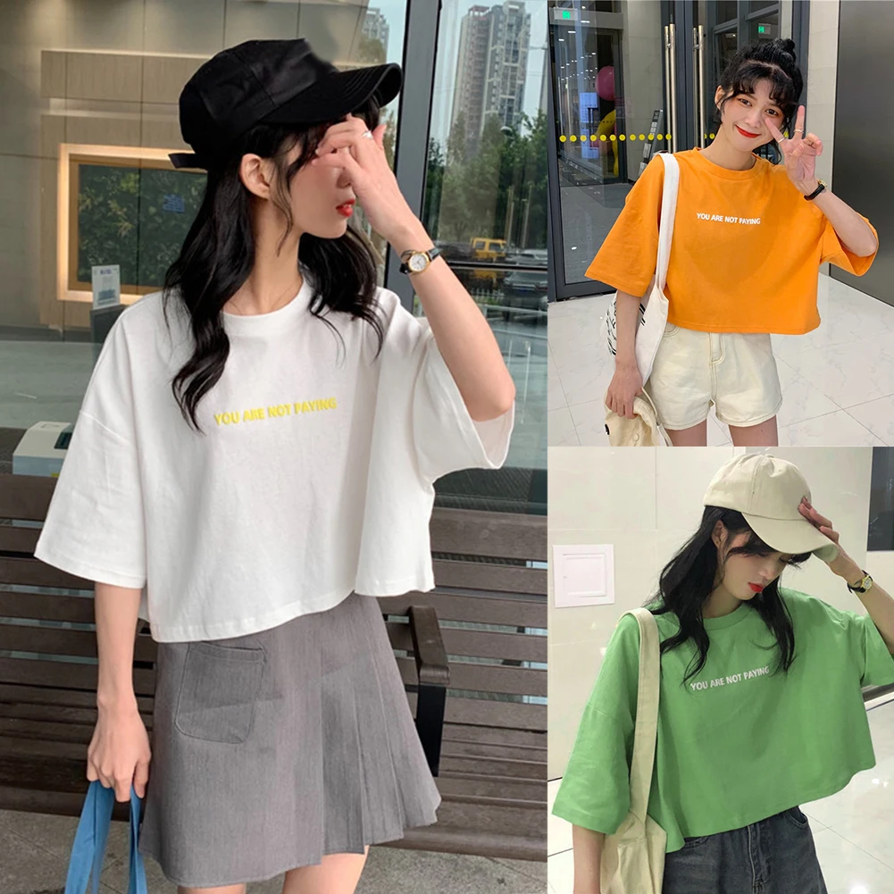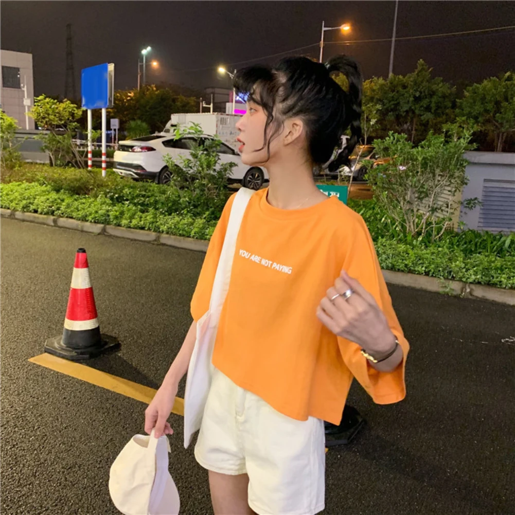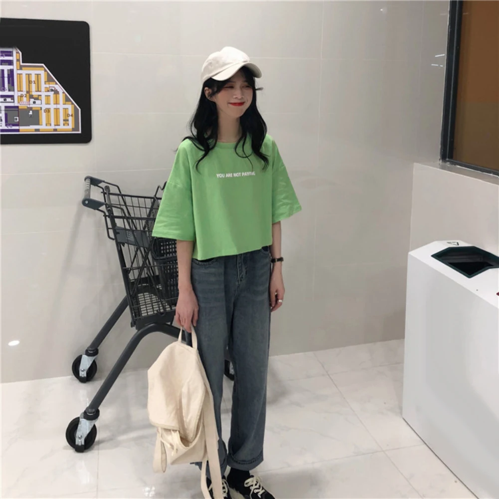 Корейская стильная футболка с круглым вырезом и рукавом до локтя, Женская Повседневная Свободная летняя футболка, топ для девушек