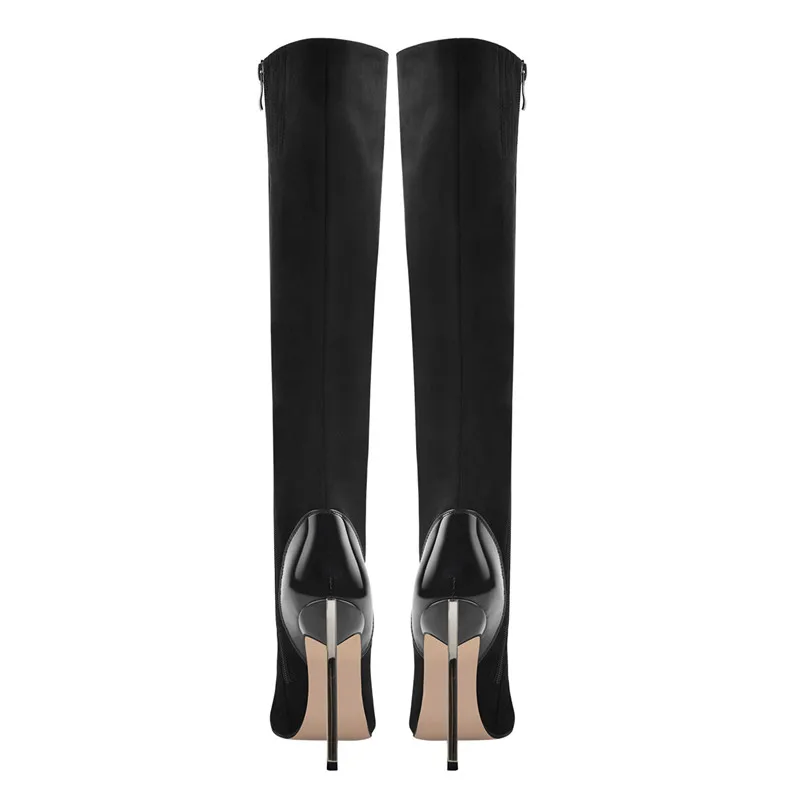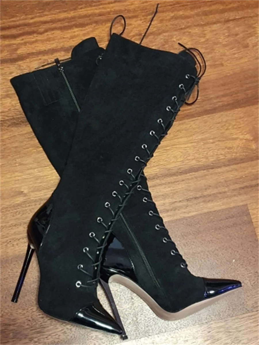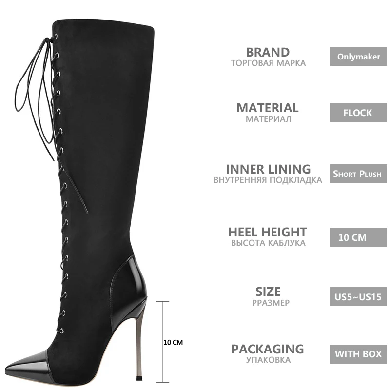 Onlymakerженские пикантные Черные Сапоги выше колена на высоком каблуке с острым носком и молнией сбоку из флока на шнуровке
