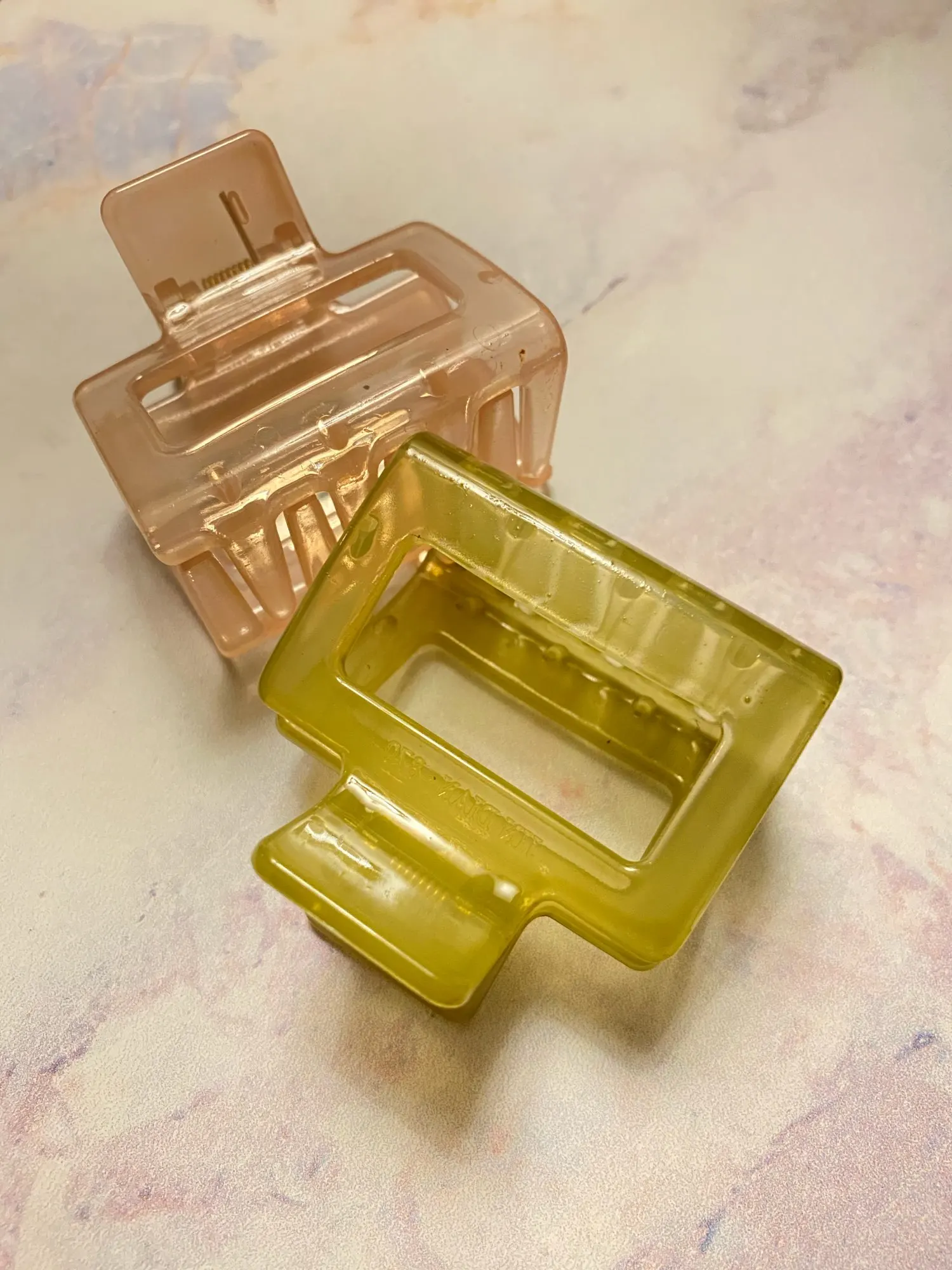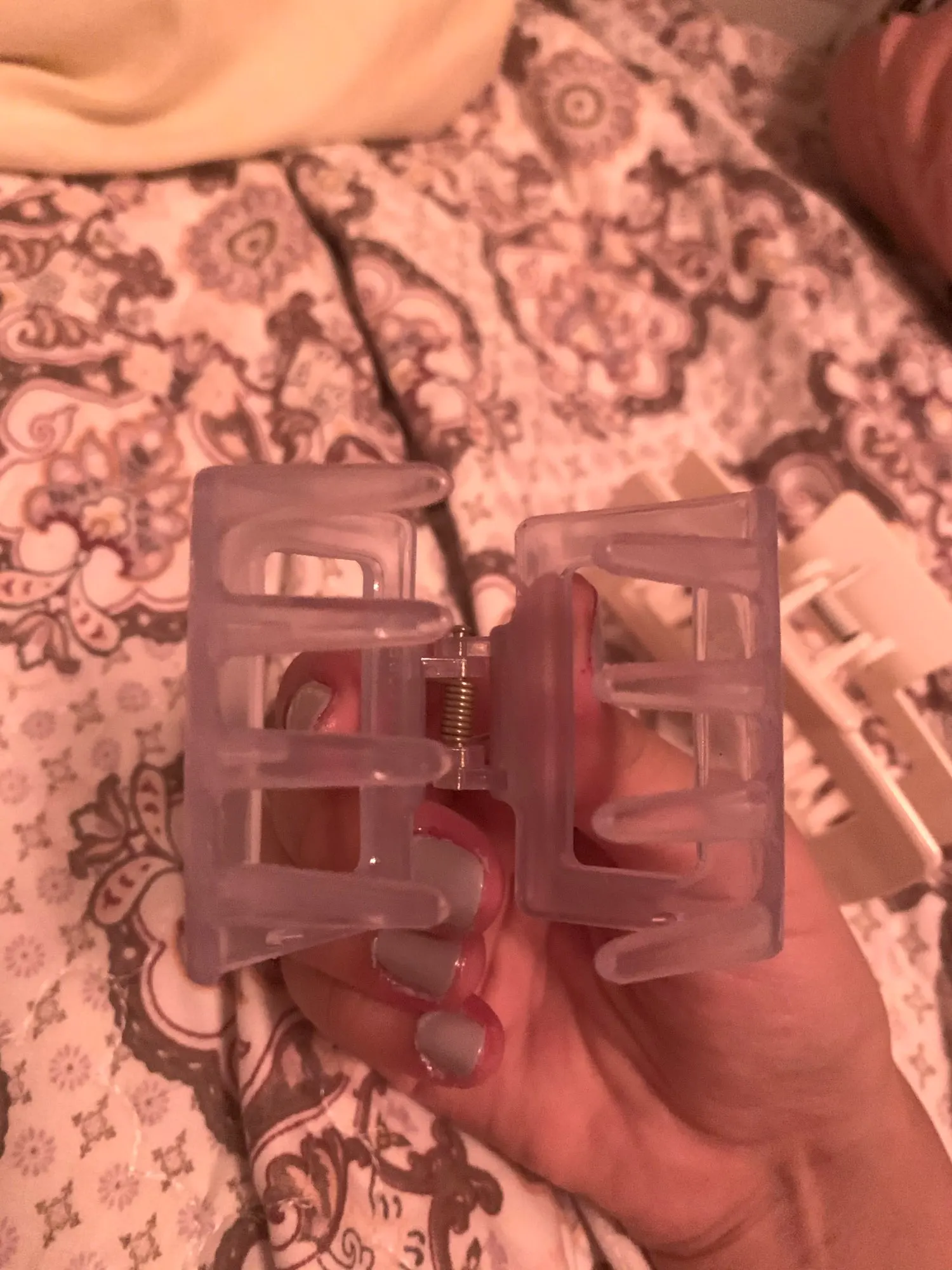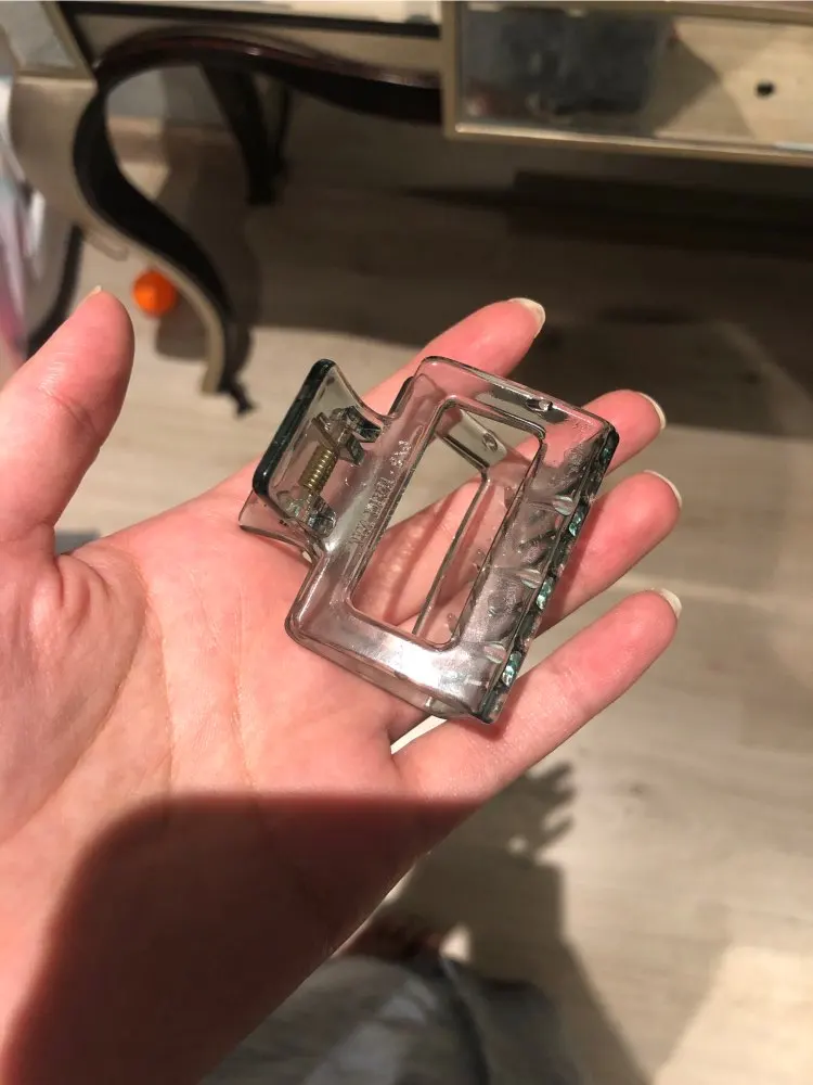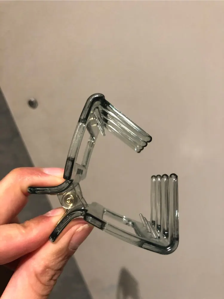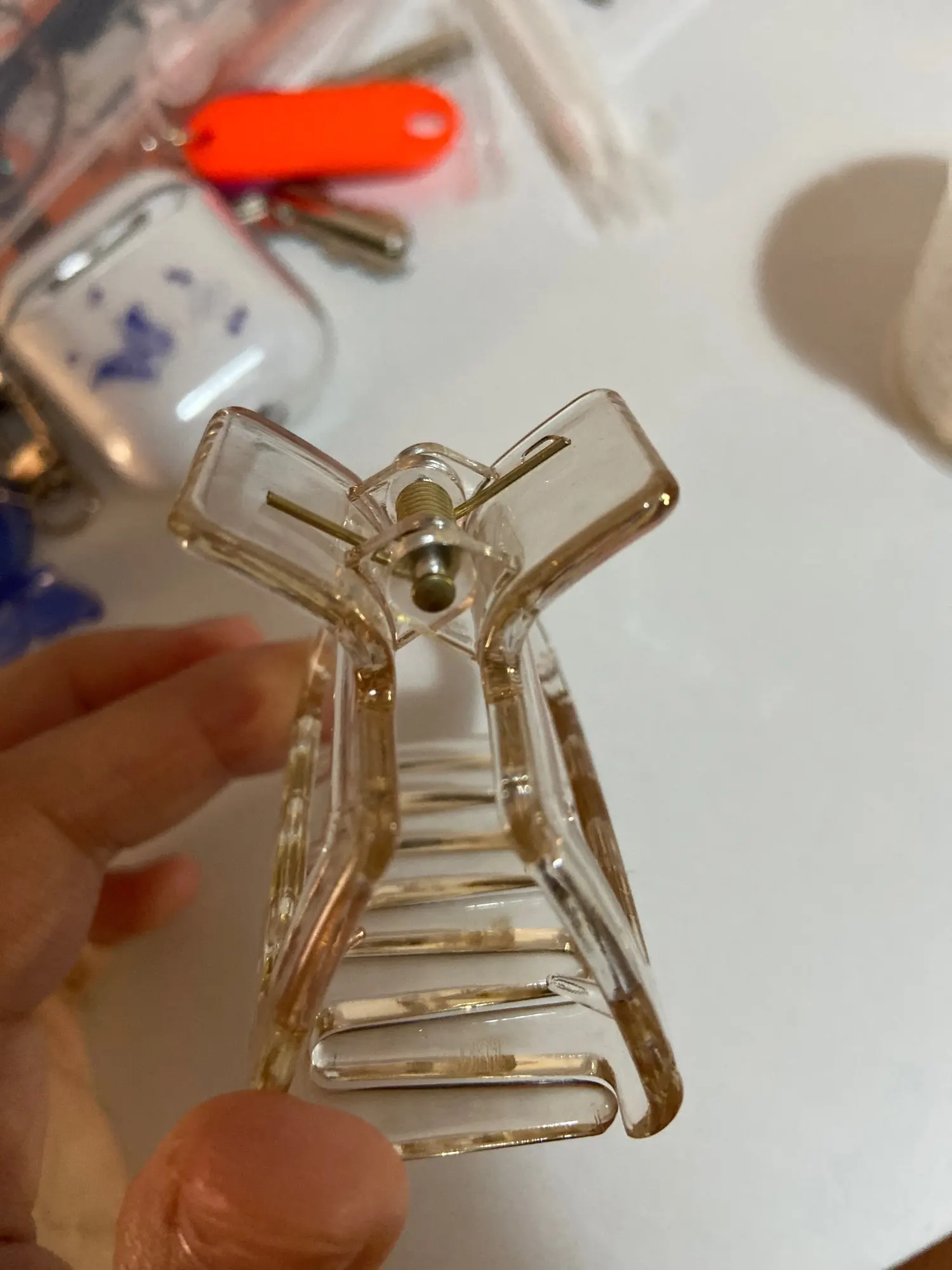 Отличное качество! Люблю их обоих! Чем больше эта модель, тем больше у людей с большим количеством волос! И чем меньше эта модель, тем больше прическа. Он не будет держать все мои волосы, так как у меня много, но понятное! В основном я хотел это для других причесок :) на картинке это два рядом с моей AirPods для сравнения размеров :)