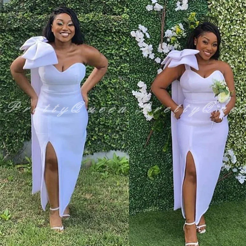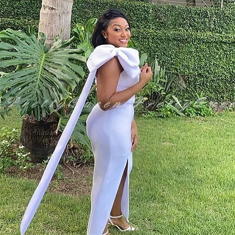 Белое платье подружки невесты Русалочки с бантом, на одно плечо, с разрезом по бокам, длинное платье для свадебной вечеринки, Vestido De Fiesta De Boda, на заказ, по оптовой цене до 100, со шнуровкой сзади