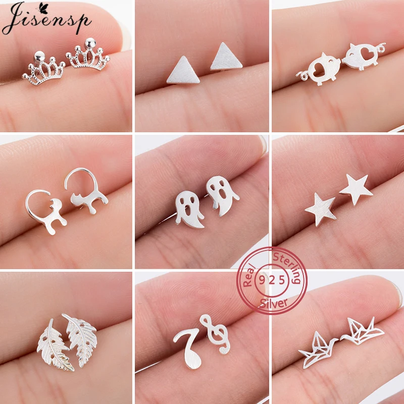 Женские серебряные серьги-гвоздики в виде животных, настоящие 925 пробы, минималистский стиль, звезда, кот, треугольник, музыка, лучший подарок для детей, не вызывает аллергии