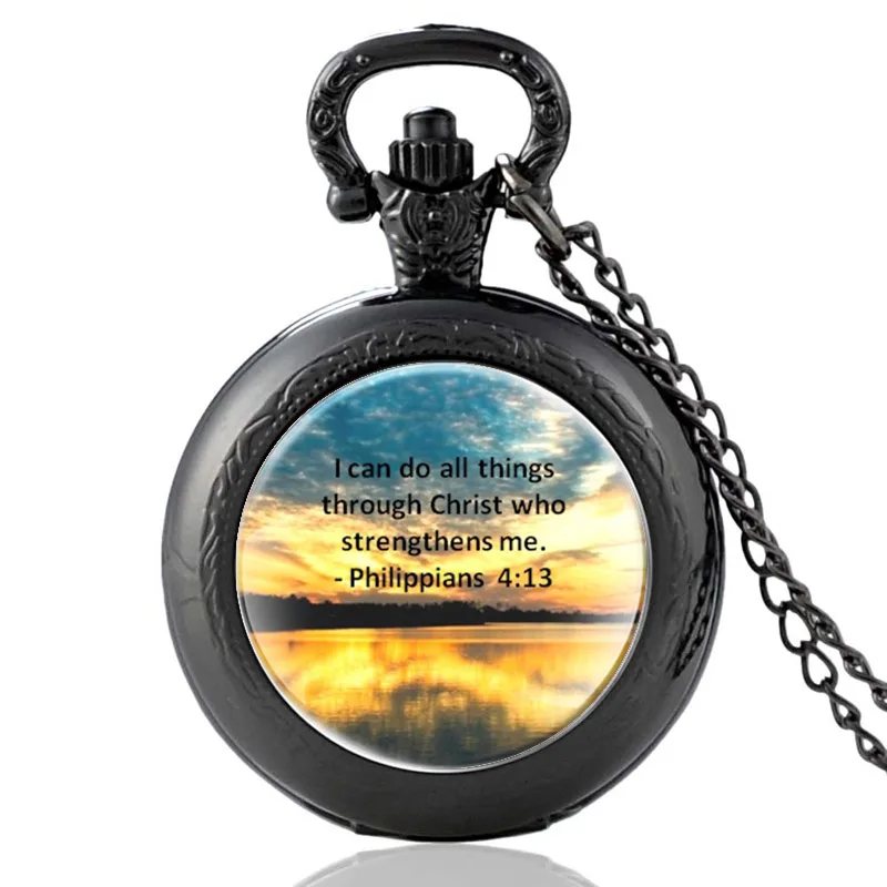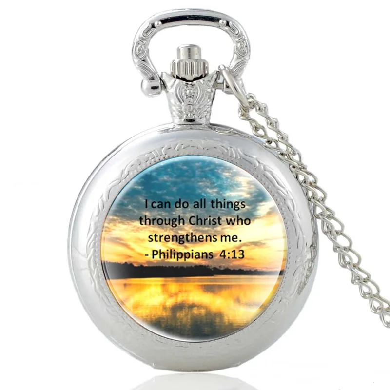 Сюжет Библии я могу делать все вещи через Христа, который укрепляет меня, кварцевые карманные часы для мужчин и женщин, ожерелье с подвеской, часы