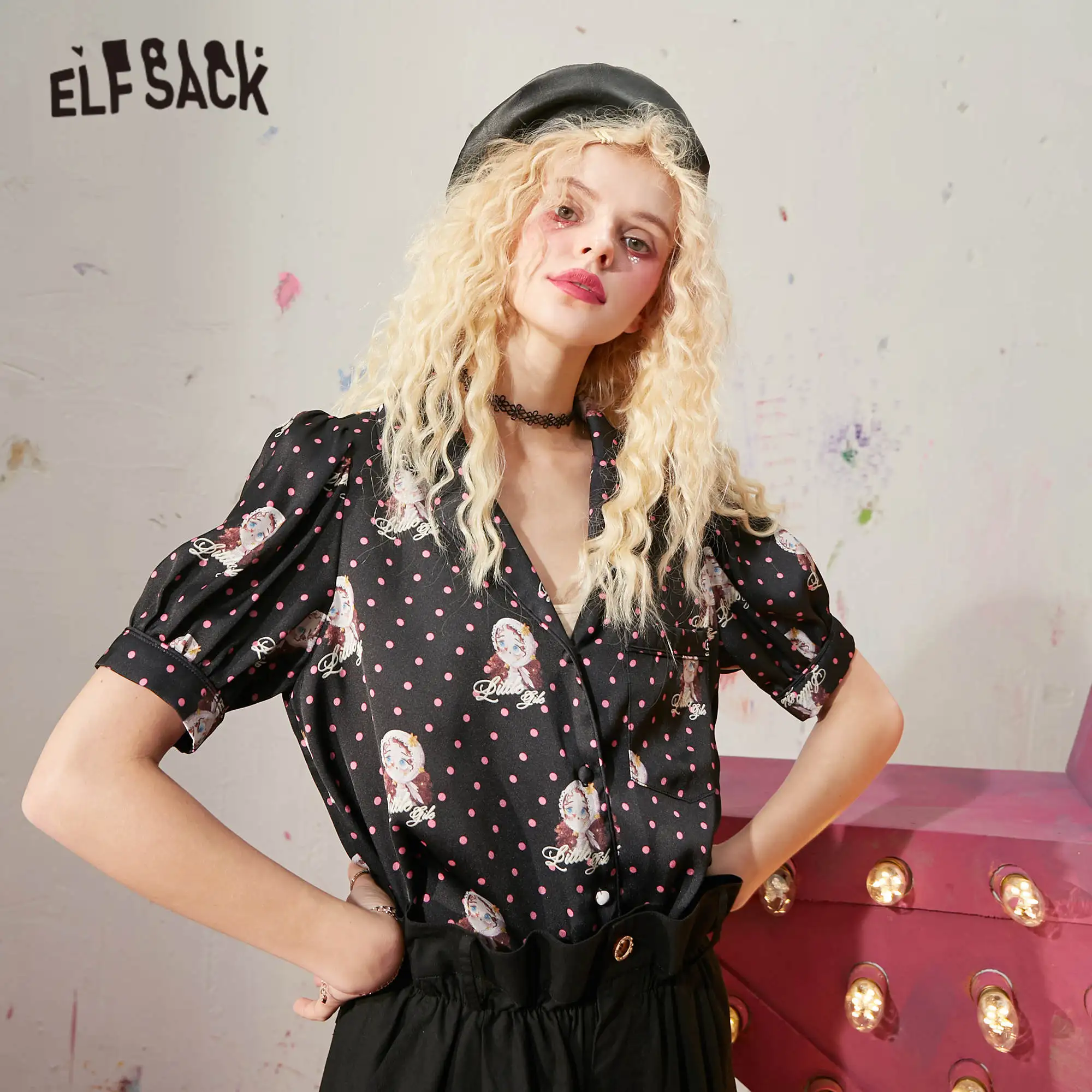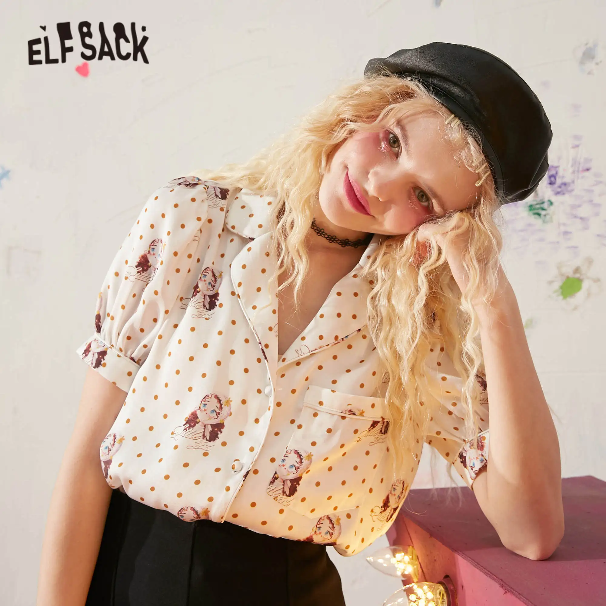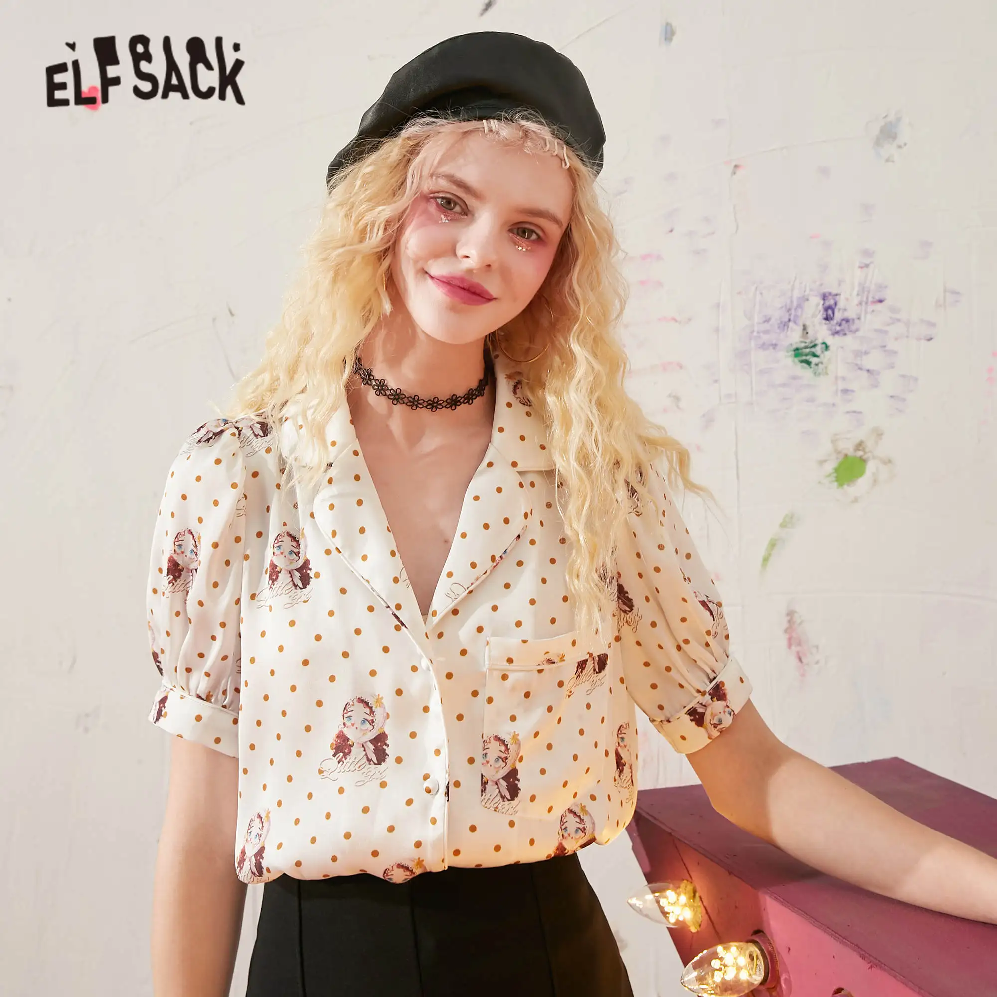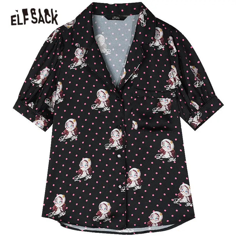 Женские атласные рубашки ELFSACK в белый горошек с графическим принтом, повседневный топ с пышными рукавами эльфа, корейские повседневные милые топы для девушек, лето 2020