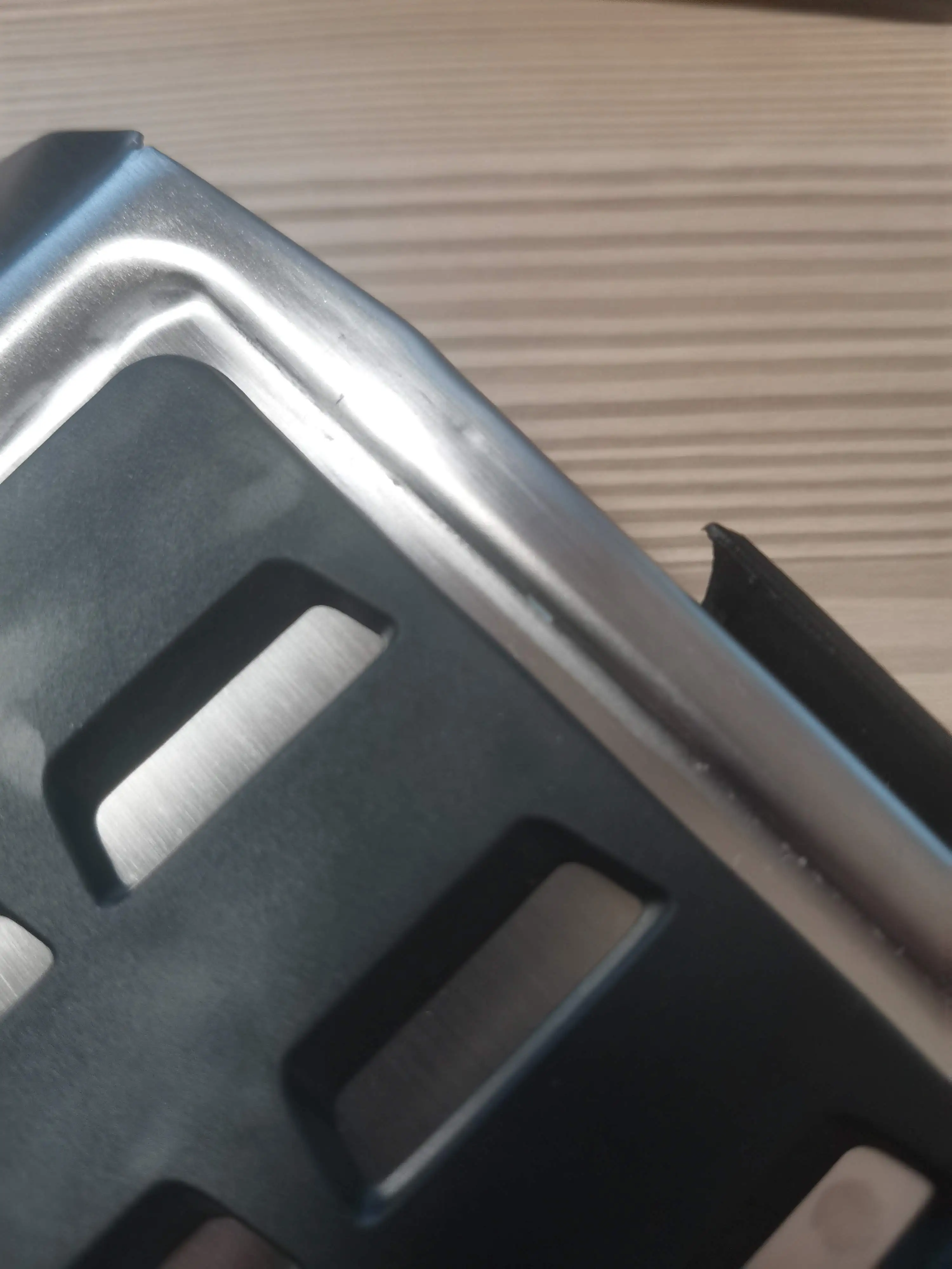 Качество изготовления очень посредственное. Маленькие накладки более мене качественные, хотя железная часть без всякого покрытия и будет ржаветь очень быстро. Большая накладка загнута неравномерна, присутствуют вмятины (не транспортировочные). Пластиковое литье в очень заметных ямках. С металла даже не счищена металлическая стружка до сбора детали. Крепежные элементы не загнуты до конца Смотрится очень дешево и некачественно