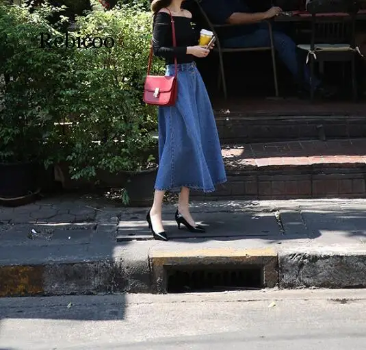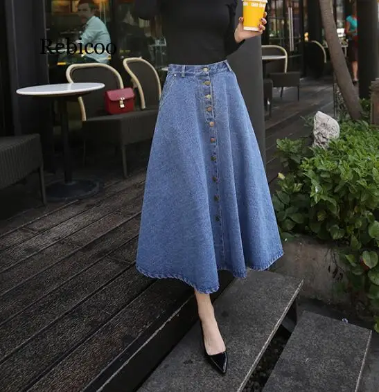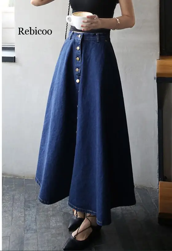 Джинсовая женская длинная юбка, модная однотонная Повседневная Джинсовая юбка в Корейском стиле преппи с завышенной талией и широким подолом, на пуговицах