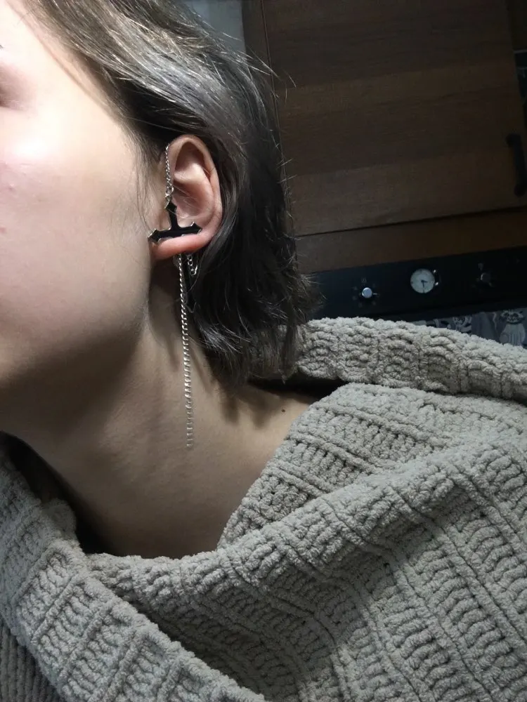 серьга на вид вроде ничего но цепочка которая с верху уха как то не продумана не красиво болтается и постоянно сползает