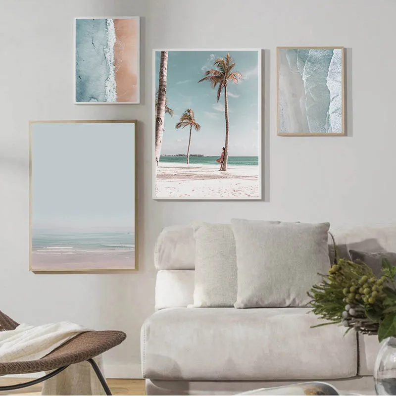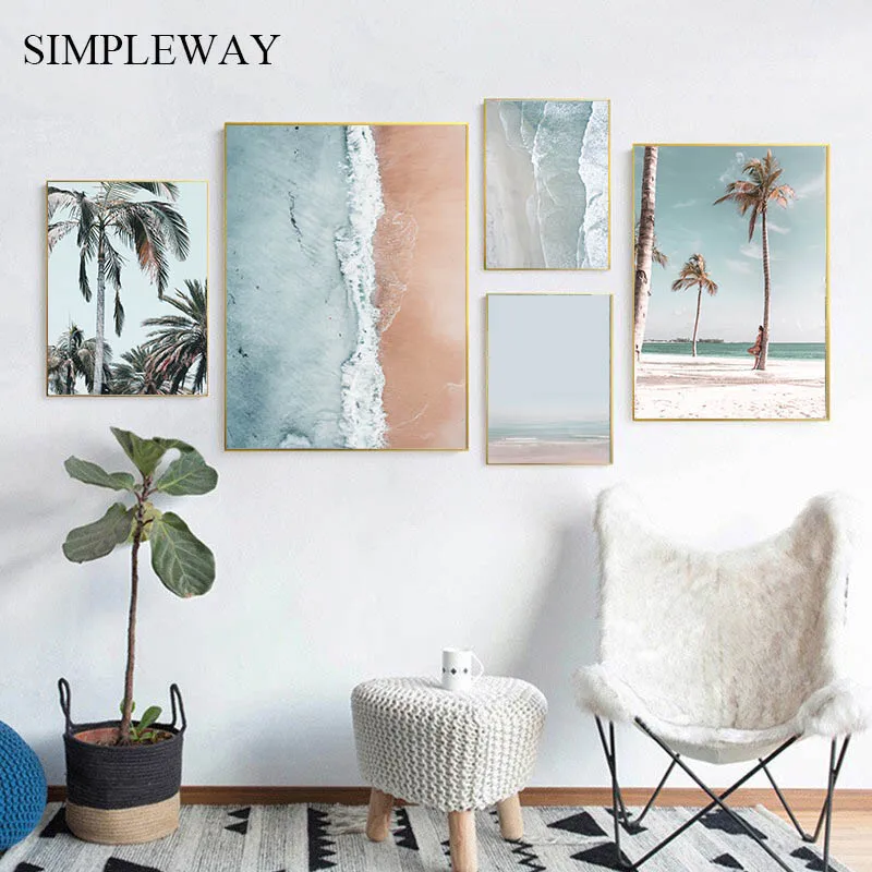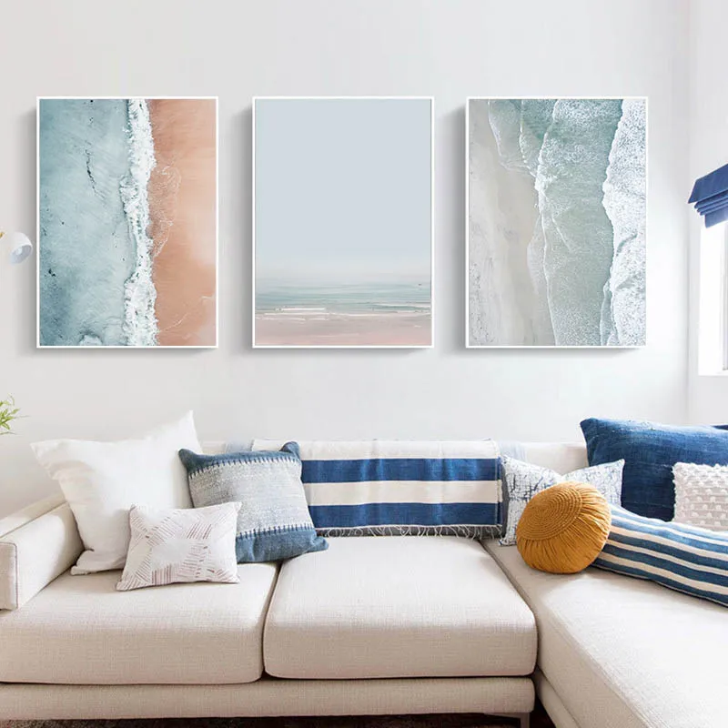 Скандинавский Пляжный Пейзаж, холст, постер, розовый океан, волны, ...