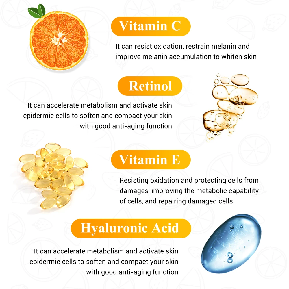 Содержит высокую активность мелкомолекулы витамина С, с антиоксидантной защитой, этот продукт может предотвратить образование меланина. Также с такими функциями, как отбеливание и осветление тона кожи, удаление пятен и меланина, он может восстановить здоровье кожи, способствовать метаболизму кожи и активировать поврежденные клетки кожи, чтобы восстановить эластичность.