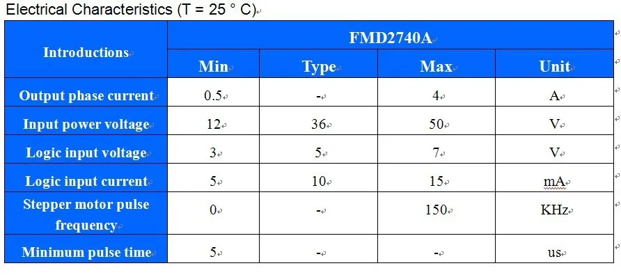 FMD2740C водитель может управлять отечественных и зарубежных производителей 2-фазный или 4-фазный мотор, для того, чтобы получить всю исчерпывающую информацию, вождение, необходимо выбрать разумное питающее напряжение и ток установка. Напряжение питания определяет уровень высокоскоростной производительности двигателя, а установленное значение тока определяет Выходной крутящий момент двигателя.