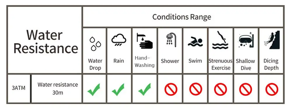 Подходит для капель воды, дождя, ручной стиркиНе используйте его в душе, плавании, напряженных упражнениях, мелком погружении, глубине погружения