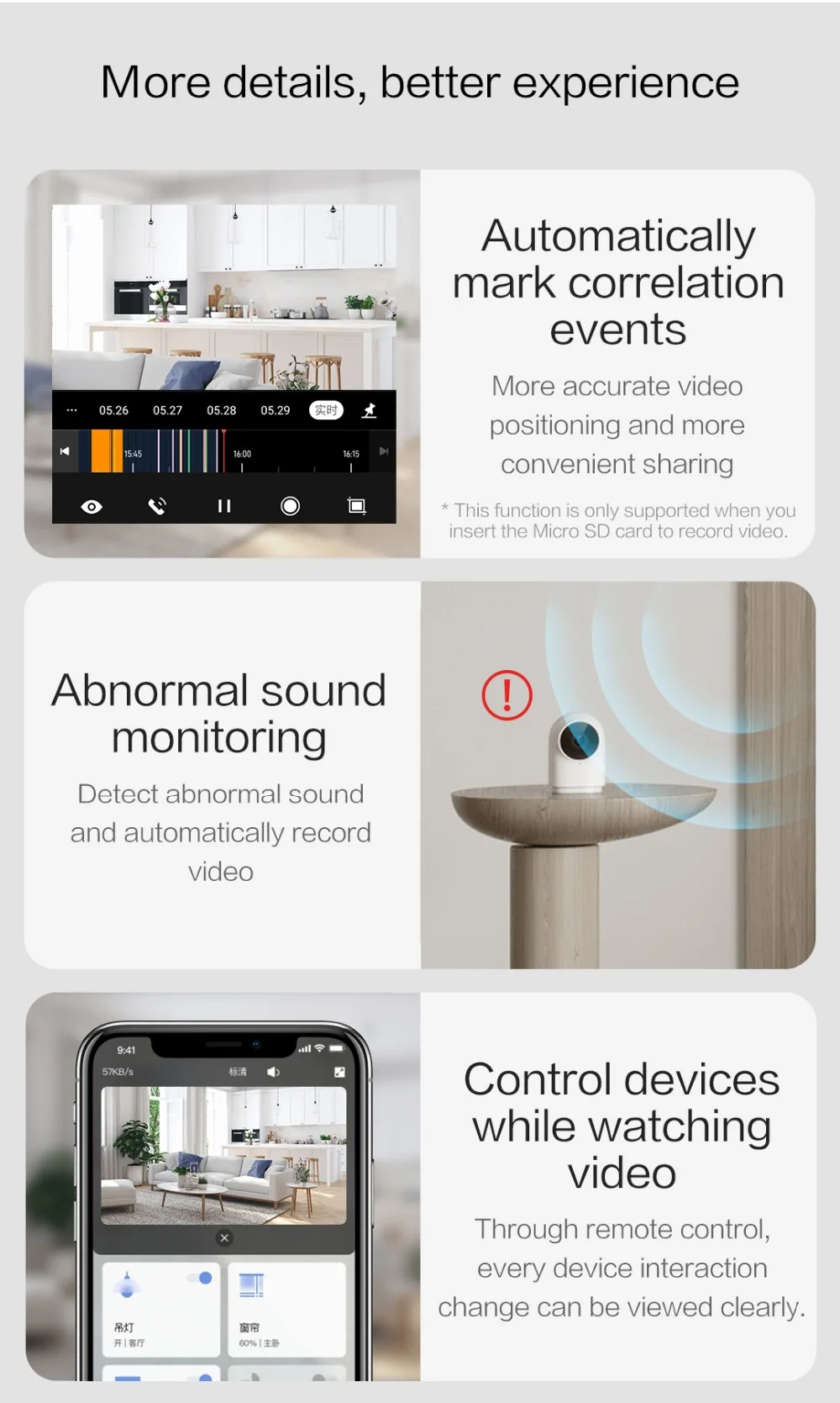 1. 1080P супер чистый 2. Широкий угол обзора 140 ° 3. Шлюз Zigbee 4. Полный дуплекс Интерком 5. Сообщение с одним ключом 6. Обнаружение движения AI 7. Обнаружение звука 8. Доступ к экосистеме Homekit 9. Бесплатная сигнализация видео Облачное хранилище 10. Быстрое воспроизведение вперед Главная безопасности 1. В сочетании с функцией шлюза, удобно проверять состояние дверей, окон и приборов в доме 2. Наблюдайте за перемещением членов семьи, записывайте повседневную жизнь, остерегайтесь несчастных случаев; 3. Контролируйте дом 24 часа в сутки, чтобы предотвратить прибытие воров в дом, захватить доказательства и защитить безопасность собственности. Удаленное взаимодействие 1. Видеозвонок с семьей удаленно через приложение, заботясь о своей повседневной жизни и сублимационных семейных чувствах; 2. Дома, записывайте короткое видео, чтобы поделиться с семьей, которая выходит, чтобы поделиться счастьем. По уходу за ребенком 1. Когда вы работаете или путешествуете, ребенок учится дома? Вы спите поздно? Вы закончили работу по дому? Не нужно беспокоиться, открыть мобильное приложение, следить за работой ребенка, отдыхать и учиться через удаленное видео, контролировать ребенка в режиме реального времени, попросите ребенка иметь более эффективную праздничную жизнь и развить хорошие привычки Уход за домашними животными 1. Когда нет дома, кошки, собаки и кошки играют непослушно, обманывают или уничтожают все дома, делятся ими в социальных кругах с помощью коротких видеозаписей и делятся радостью с друзьями; 2. Соблюдайте правила диеты домашних животных, работы и отдыха в режиме реального времени, установите время кормления и потребление пищи в соответствии с результатами, научно Растите домашних животных и Обеспечьте здоровье домашних животных.