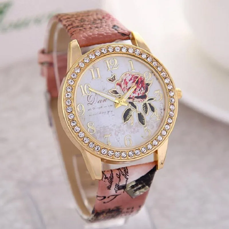 Женские наручные часы reloj mujer с розами, кожаным ремешком с граффити, женские часы relogio feminino