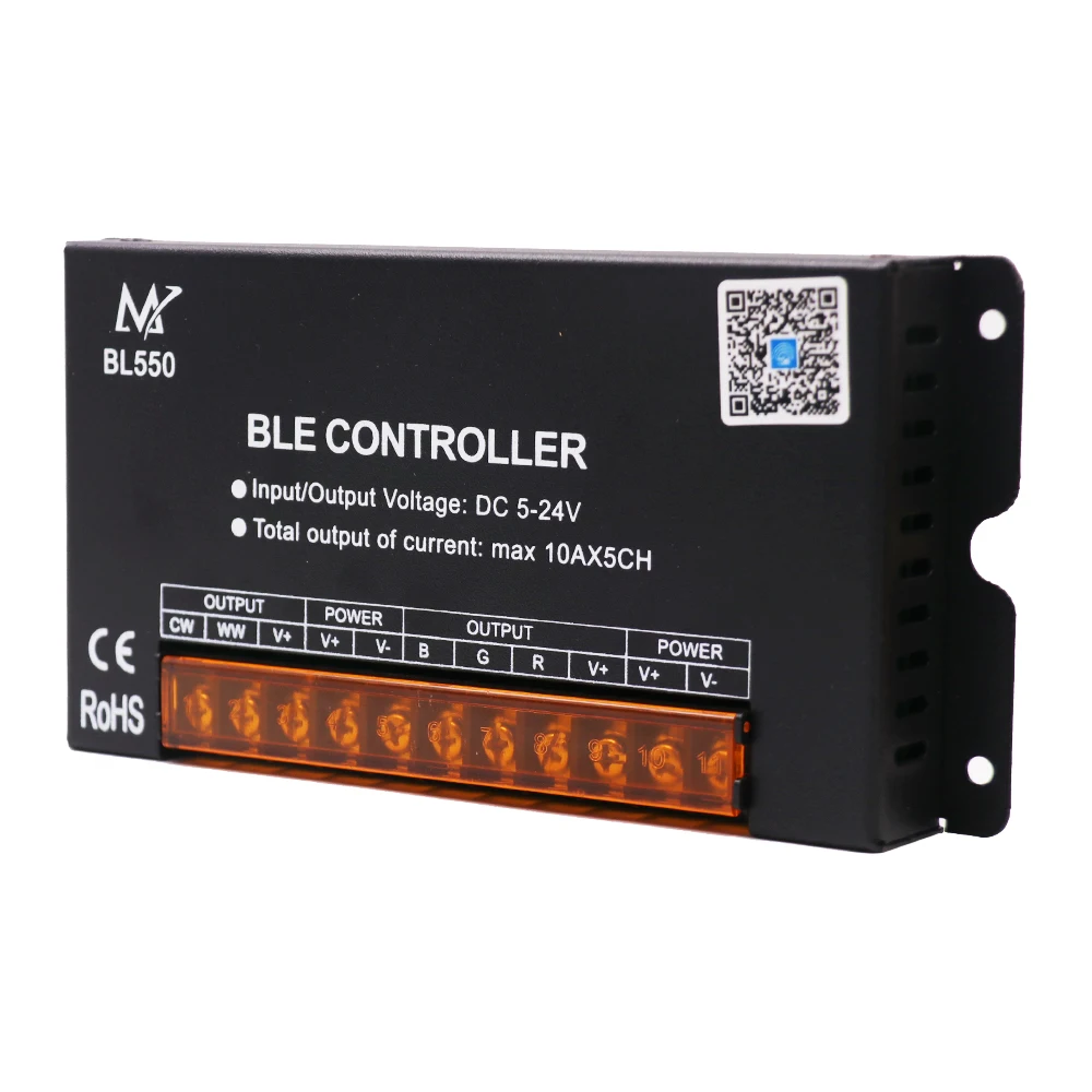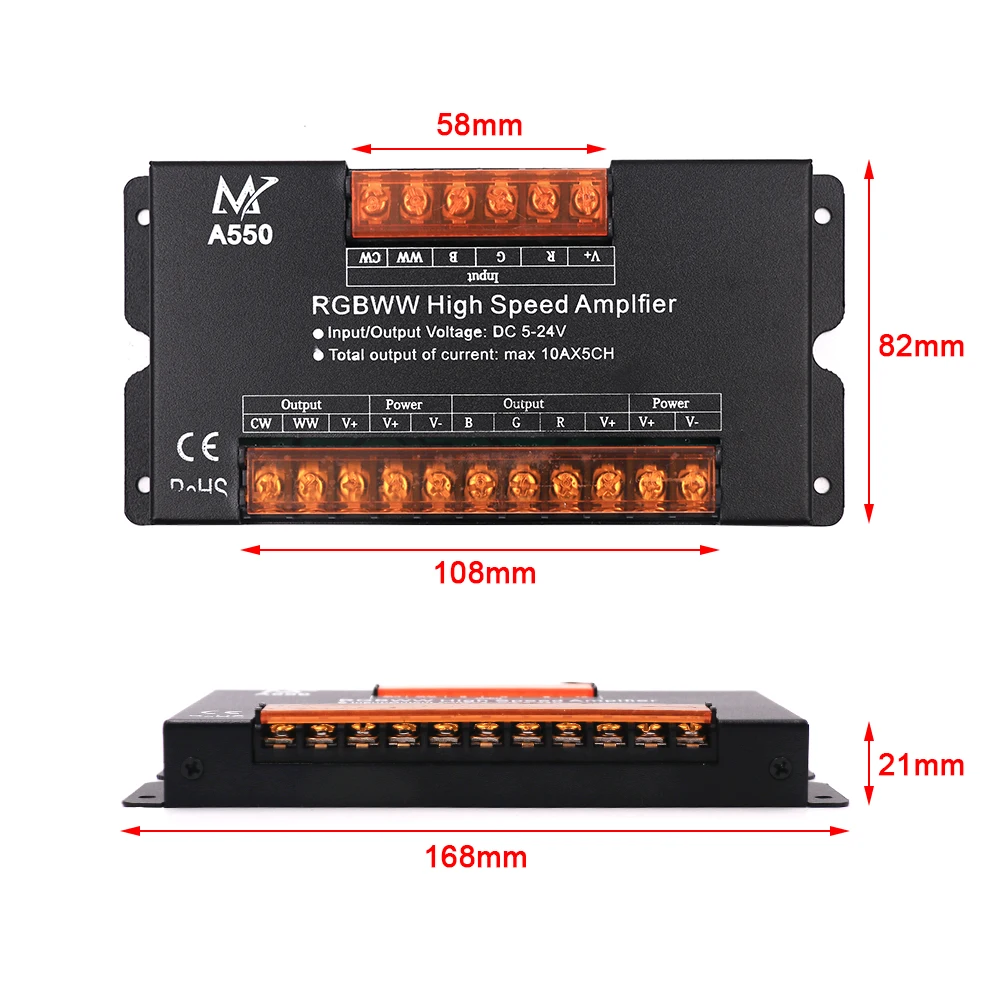 Характеристики: Клемма подключения: режим винтового подключения, калибр Клеммы 7 мм Режим подключения: общий анод Выходной ток: <50 А Общая мощность тока: макс. 5*10 А Рабочее напряжение: DC5V-24V Напряжение сигнала: DC5V-24V Выходная мощность: 5 В:<250 Вт, 12 В:<600 Вт, 24 В:<1200 Вт Рабочая температура: -20-60 ℃ Размеры: L168 x W82 x H2 мм Степень IP: IP 20 не водонепроницаемый Время задержки: 20 нс CW = белый, WW = теплый белый, B = Синий, G = Зеленый, R = красный. Контроллер rgbwwОсобенности: Он может быстро усиливать сигнал RGBCCT/RGBW/RGB и других световых полос, так светильник световая полоса не имеет падения напряжения, и может работать с более длинной световой полосой. RGB bluetooth-контроллерОсобенности: Способ подключения: Bluetooth 4,0 или выше Применимая операционная система Мобильный телефон: IOS версии 6,0 или выше, Android версии 4,3 или выше Подходит для светодиодной ленты RGB/RGBW/RGBWW с затемнением. Мобильный телефон с Bluetooth удаленное управление через приложение, 20 изменений режима, а также имеет регулировку цвета освещения/регулировку музыки/функцию переключения времени. RGB wifi контроллерОсобенности: Способ подключения: Wi-Fi Эффективное Расстояние управления: в пределах 30 метров Подходит для: светодиодной ленты RGB/RGBW/RGBWW с затемнением, регулировкой цвета освещения, выбором цветового кольца и группой пользовательских режимов. Одноцветный диммерОсобенности: Входной сигнал: сигнал затемнения ШИМ Диапазон затемнения: 0.1%-100% Бесступенчатый контроллер затемнения. Всего пять выходов с помощью режима управления ручкой, который может независимо управлять яркостью каждого канала, подходит для одноцветной световой ленты, не подходит для светодиодной ленты RGB. Посылка входит: 1 * Усилитель 1 * Руководство пользователя (на английском языке)
