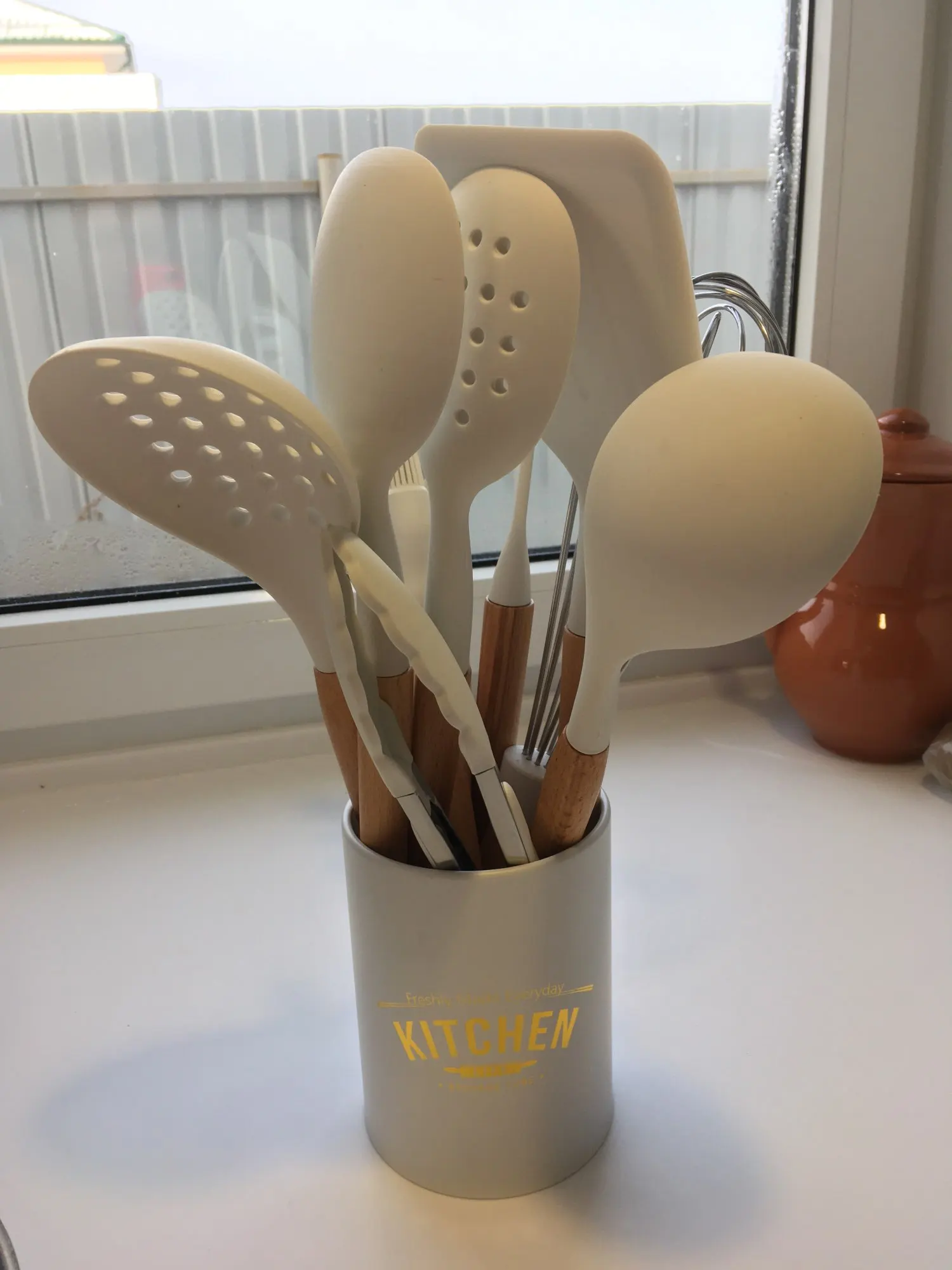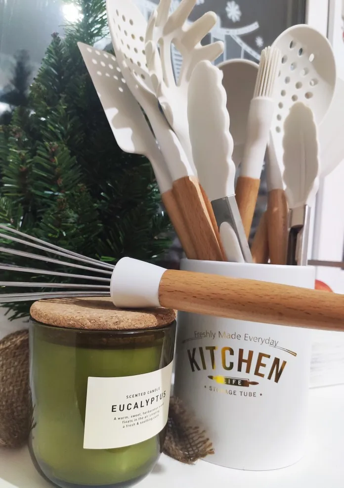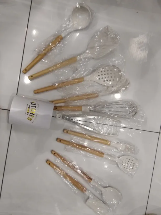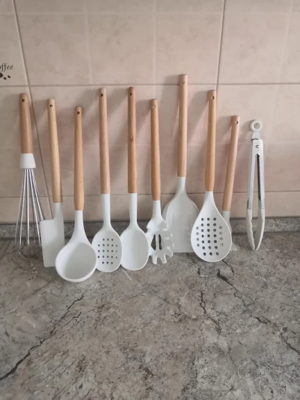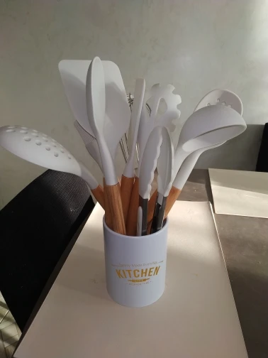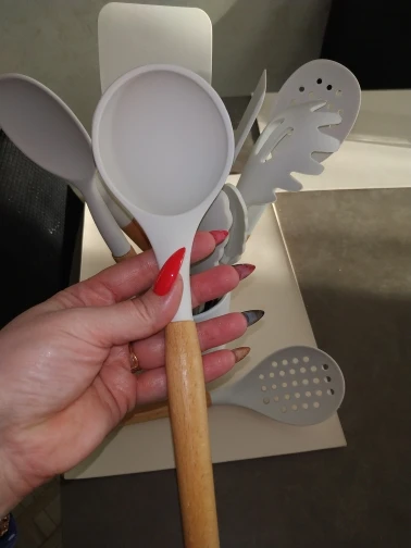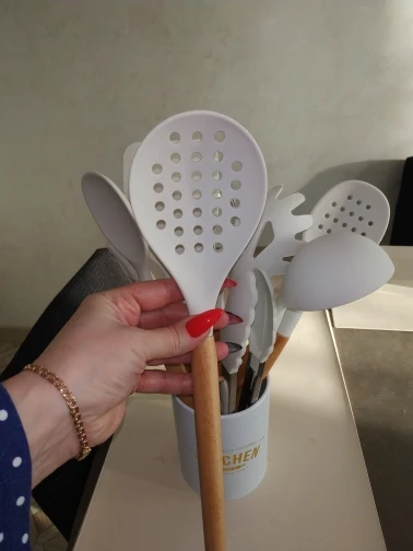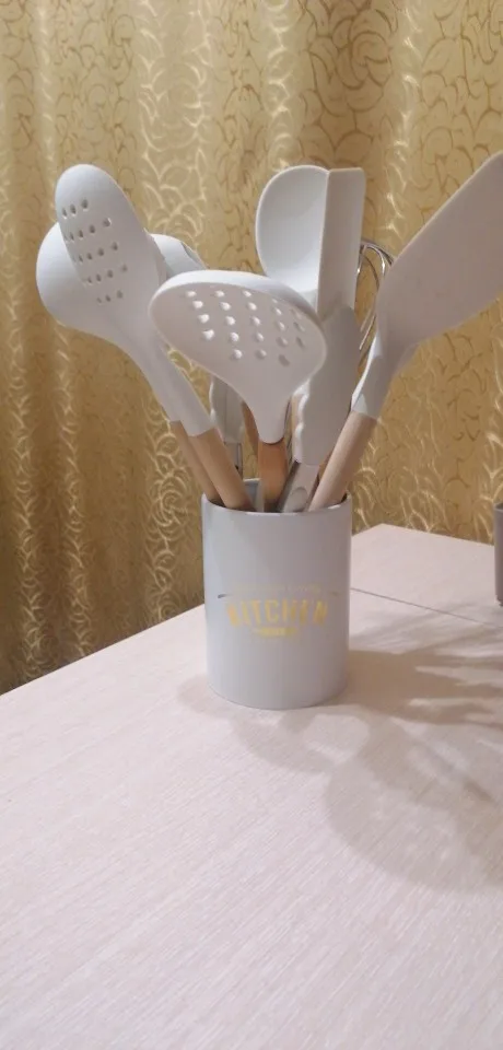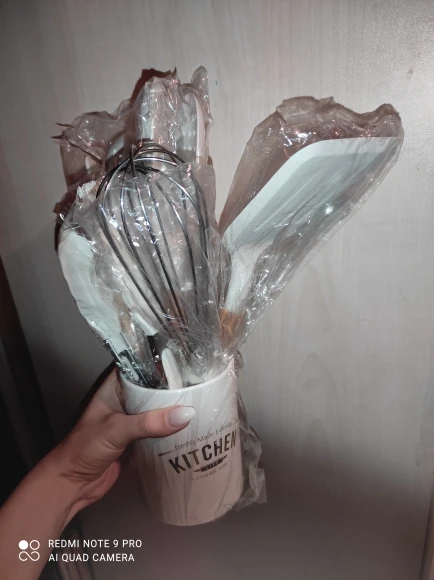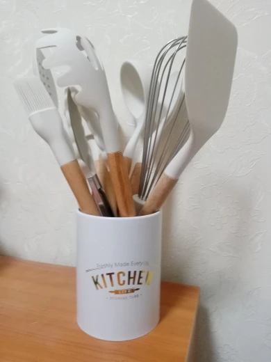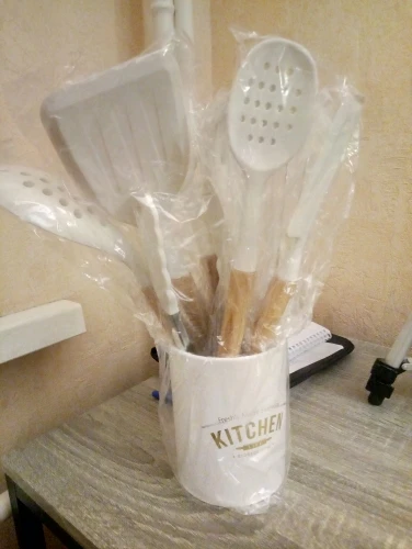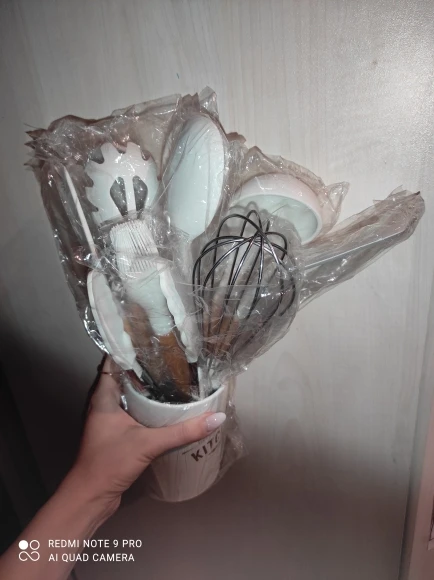 Стильный набор для современной кухни по отличной ценеНабор довольно крупный и тяжёлый. Но при этом каждый отдельный прибор не тяжёлый, просто их много. Стакан сам по себе лёгкий, но устойчивый.⠀ В набор входит: - Лопатка с отверстиями - Половник - Ложка с отверстиями - Ложка - Стандартная лопатка - Ложка для пасты - Кисточка - Венчик - Щипцы - Подставка под приборы Приборы с ручкой из дерева и с петлёй на конце, на случай если захочется повесить их на крючок. Сам прибор из силикона. Он отлично подойдёт для современной посуды, которую нельзя царапать. Ничего не воняет. Всё сделано крепко и надёжно