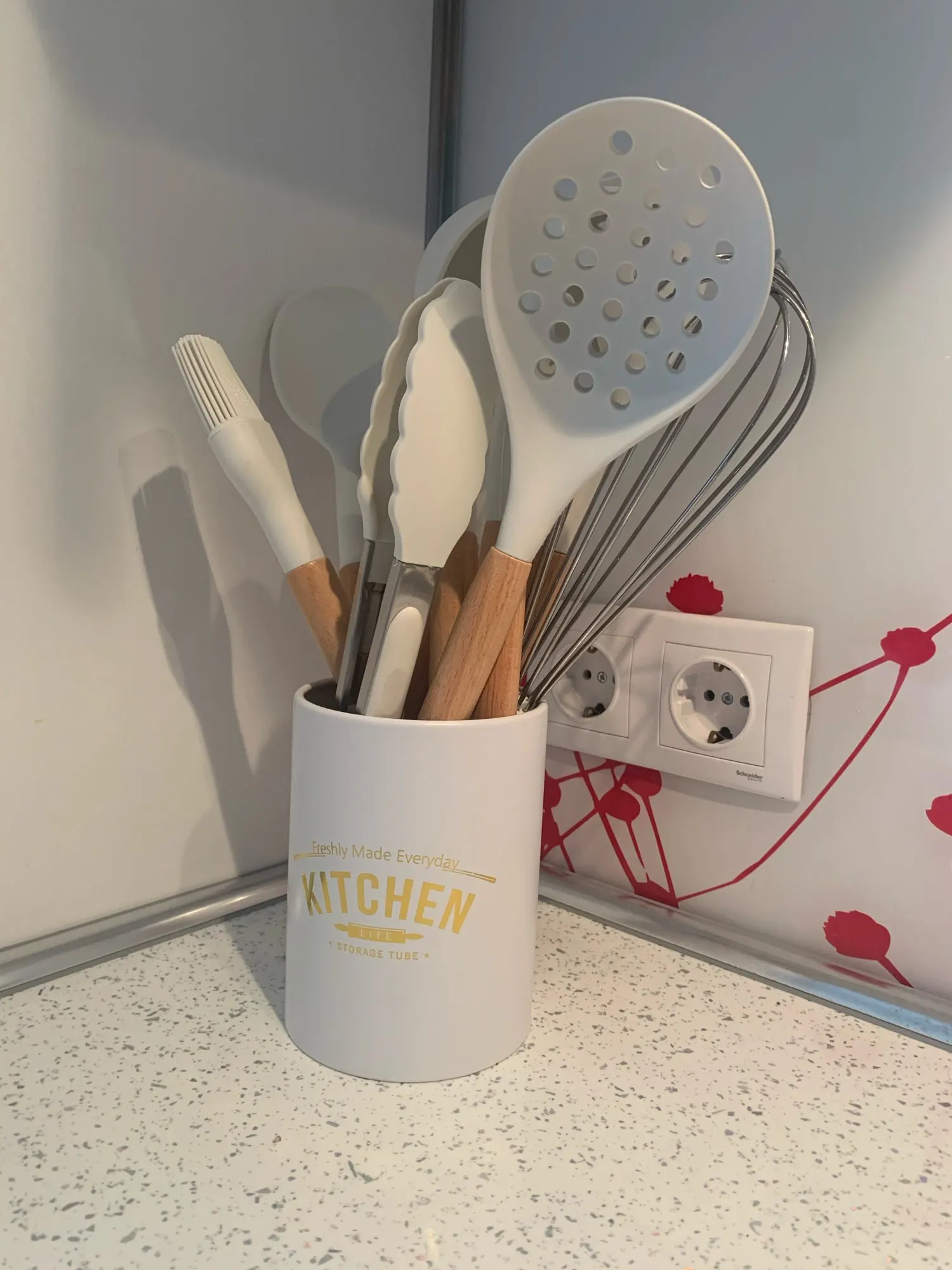 Заказала набор и к нему ещё один такой стаканчик (для вилок и ложек) стоят вместе -рядом. Смотрится дорого-богато. Спасибо продавцу. Быстрая доставка.