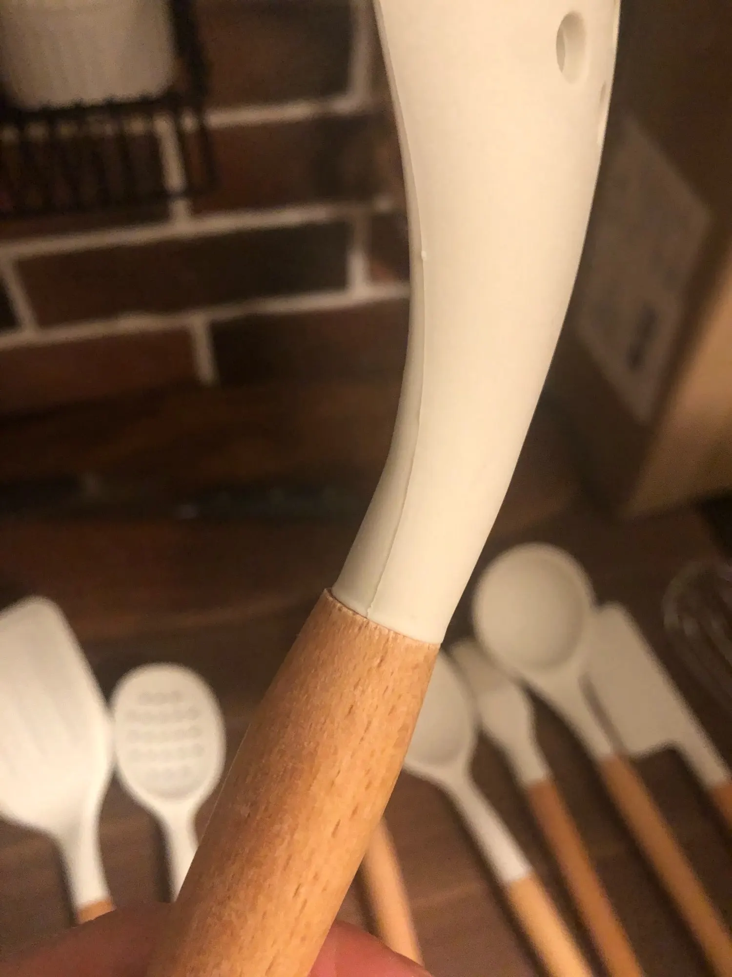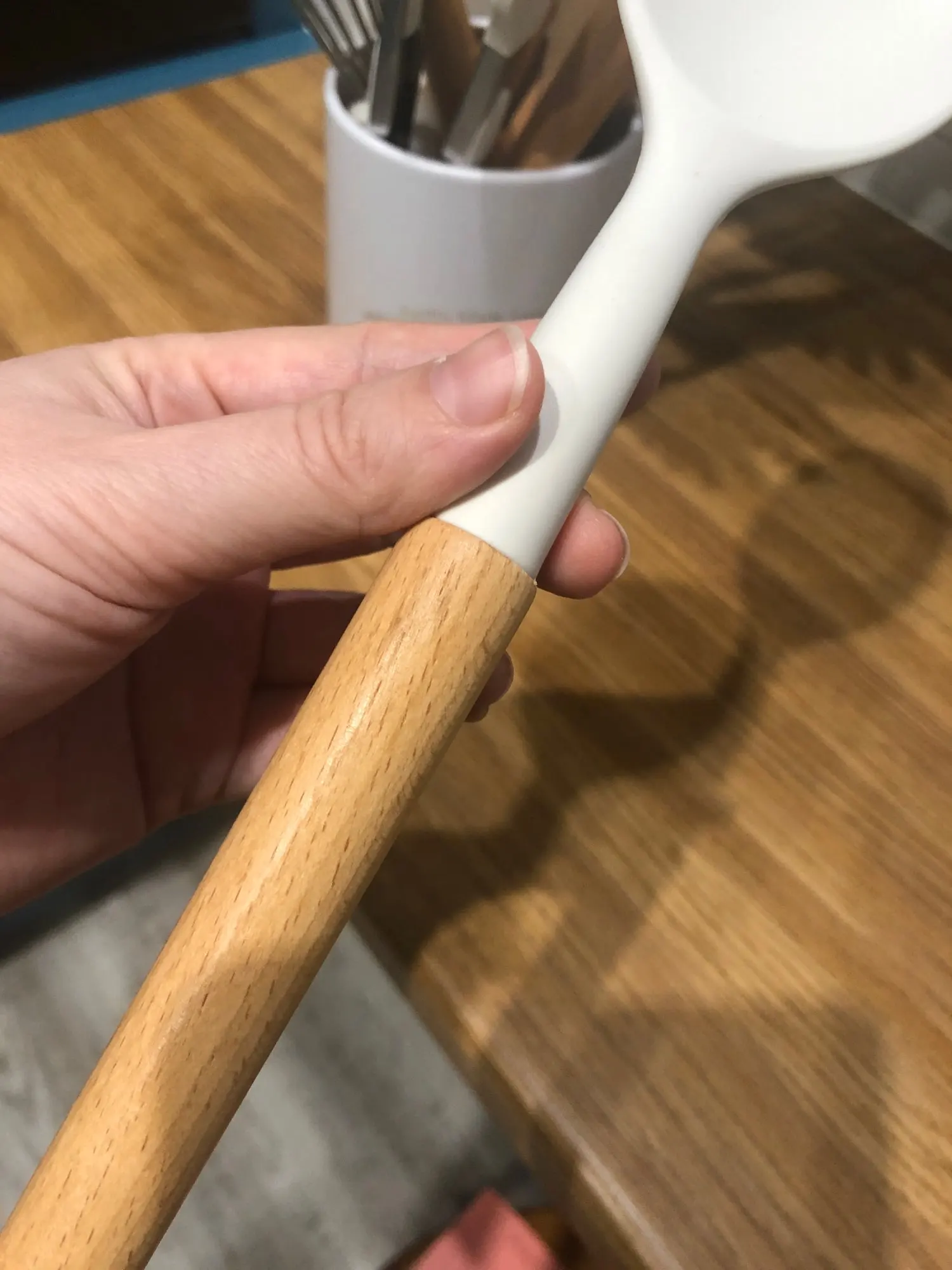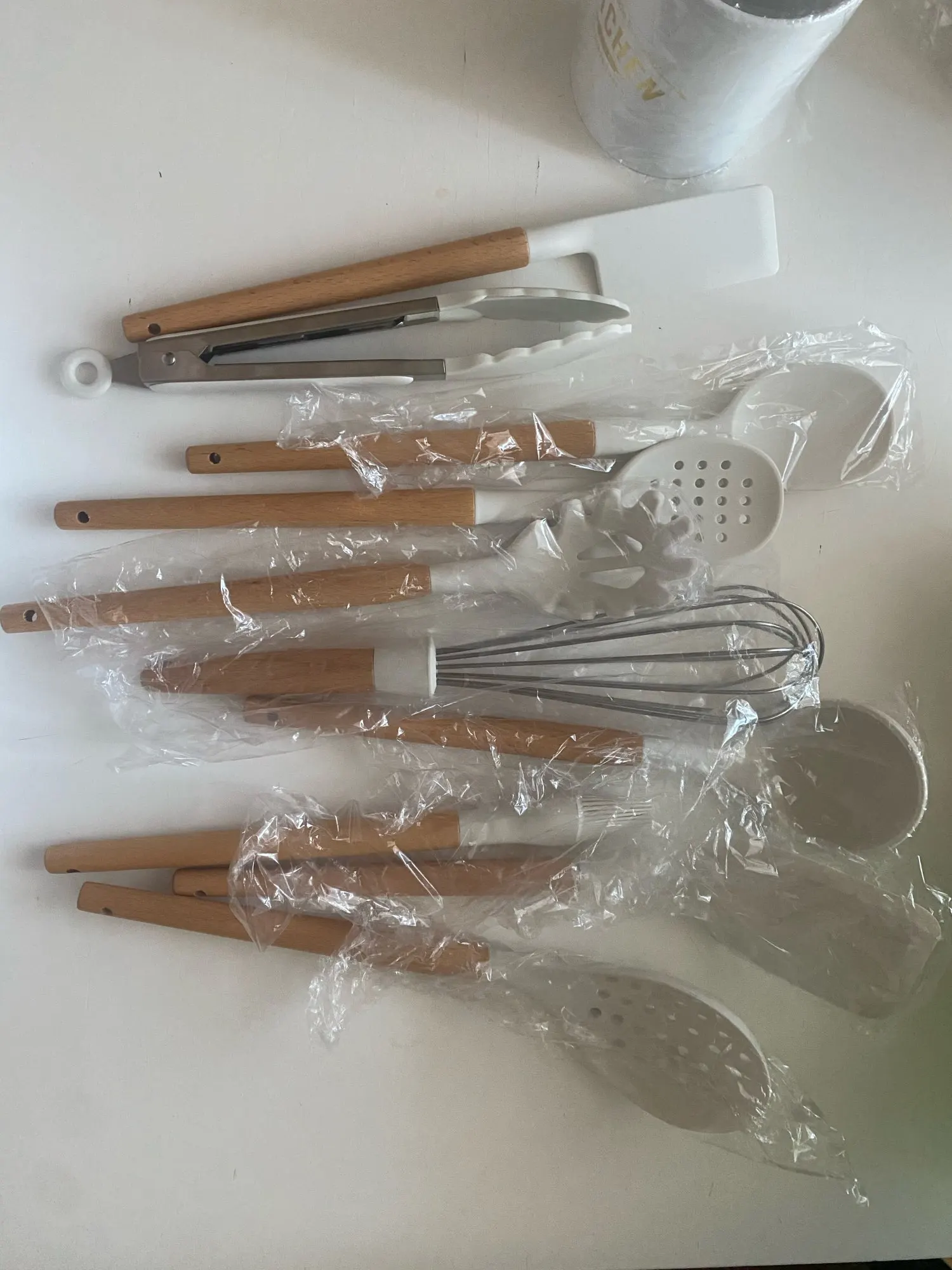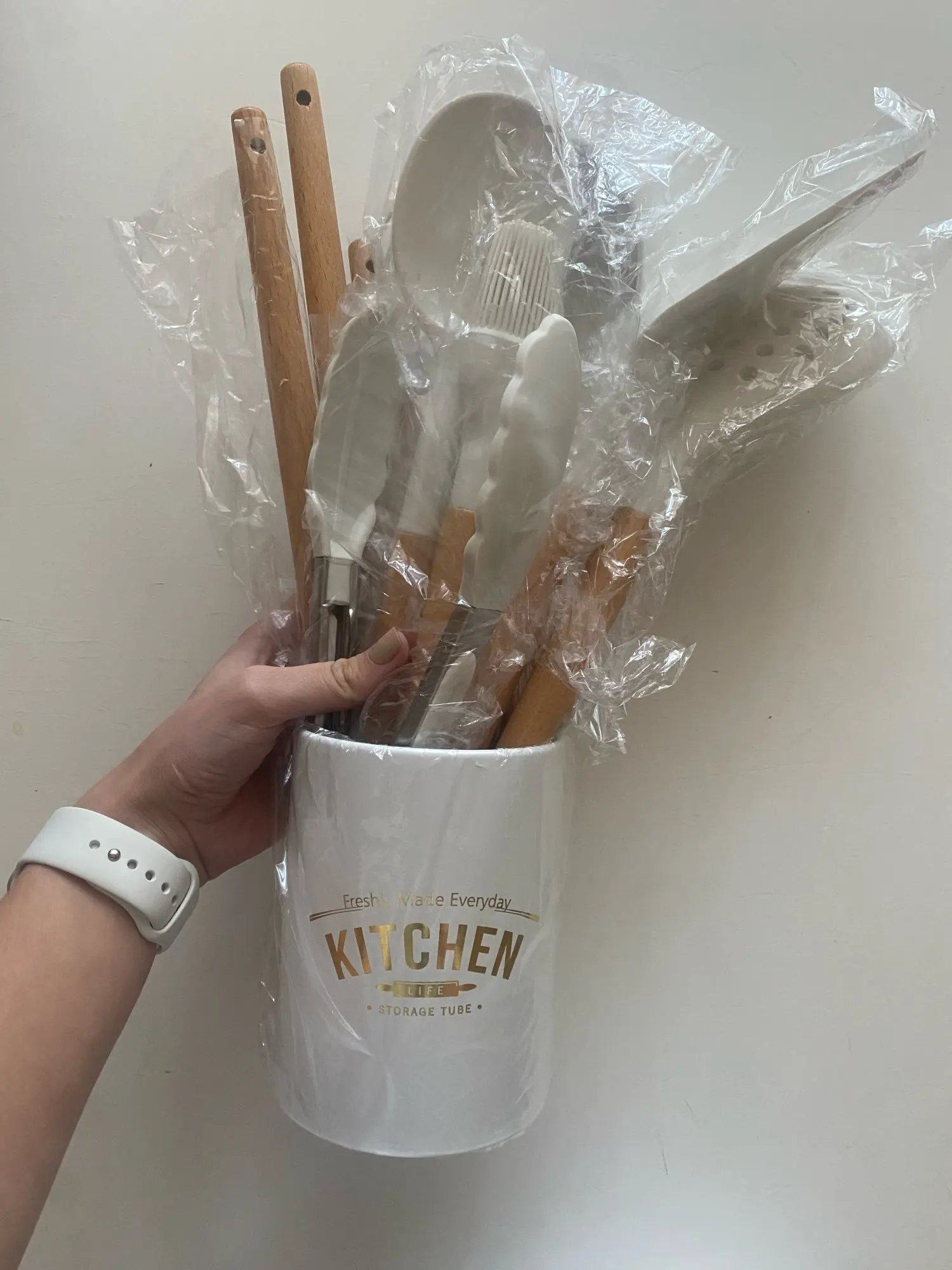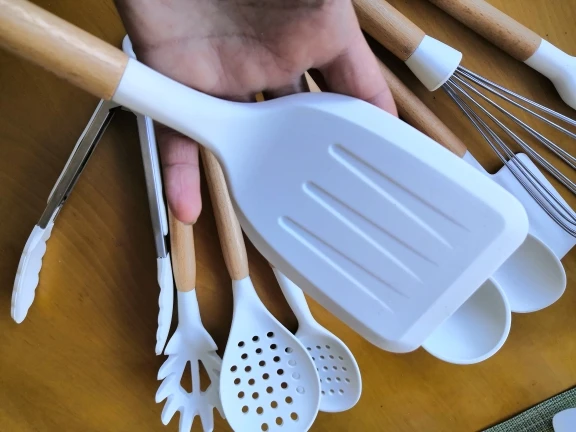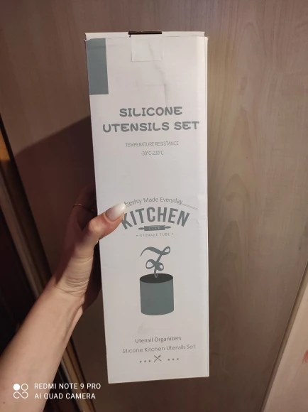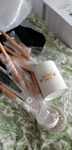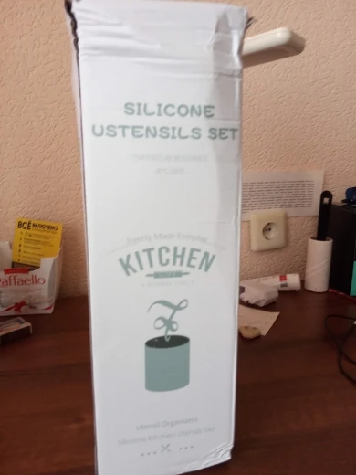 Очень довольна набором! Доставили курьером домой всего через 4 дня после заказа. Упаковка отличная, набор упакован в плотную коробку и каждая лопаточка в отдельный пакет. Все очень качественное, ручки деревянные, рабочая часть лопаток мягкая, скорее всего из пищевого силикона. На кухне смотрится потрясающе!