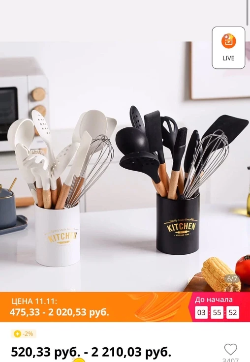 Набор просто супер, за такую цену он сказка. 8 числа заказала, 12 принесли домой до квартиры. Силикон толстый, ручки тяжеленькие, добротный, правда цвет не совсем белый, больше слоновая кость, но мне даже лучше, под новую кухню. упаковка в целости, можно и на подарок. однозначно рекомендую к заказу, покупала за 1495р.