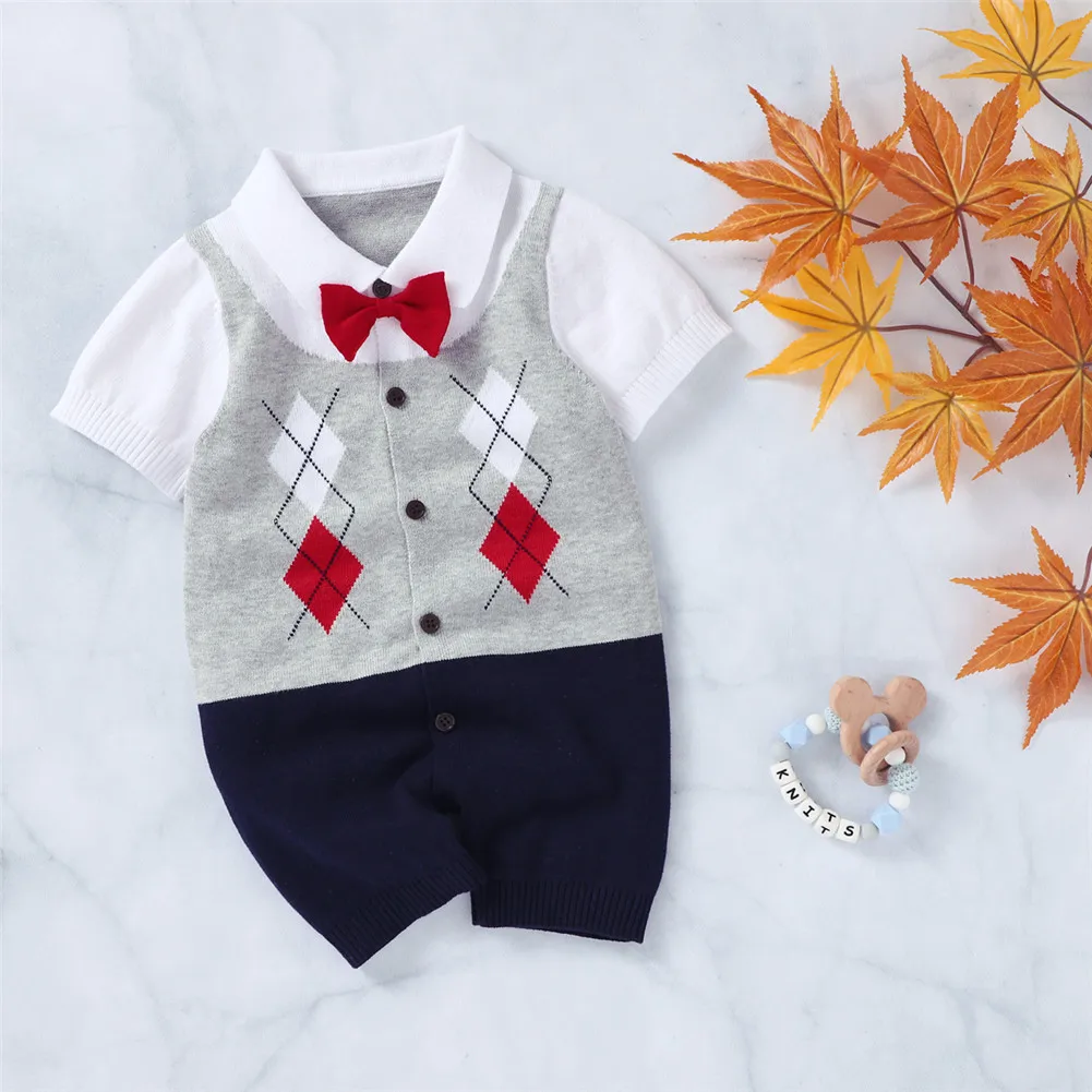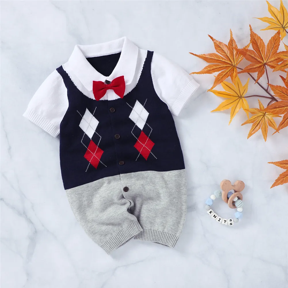 Джентльменский комбинезон для маленьких мальчиков от 0 до 18 месяцев, хлопковый комбинезон с короткими рукавами и отложным воротником в стиле пэчворк, трикотажный комбинезон в стиле пэчворк