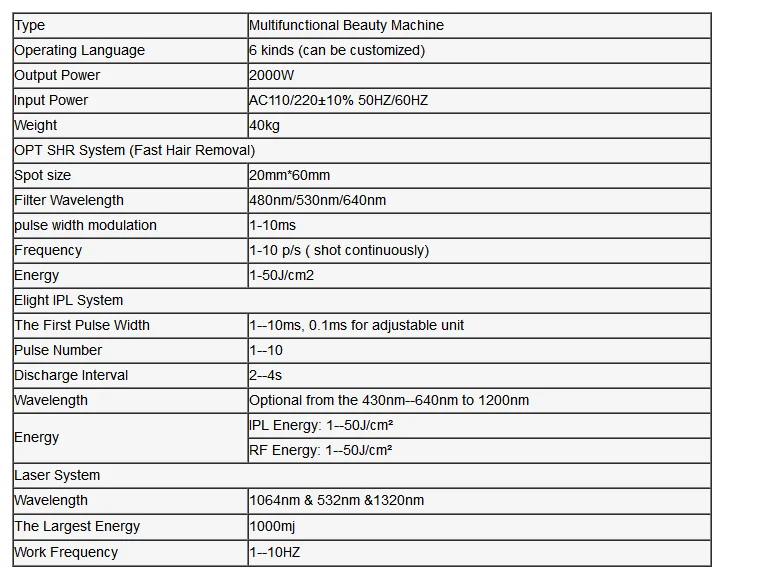 (1) Электронный светильник: использует двухступенчатую радиочастотную технологию IPL и RF для воздействия на всю дерму и соединительную ткань, стимулируя различные глубины коллагена, перестановка и рост для достижения терапевтического эффекта, двухступенчатая радиочастотная высвобожденная энергия одновременно, Использование кожи для селективного поглощения энергии светильник вызывает различные повреждения эпидермиса и дермы для получения фотопирогенного эффекта. Так как его требования к энергии на светильник намного ниже, чем у традиционного IPL, можно поглощать больше энергии от различных пигментированных и сосудистых поражений в эпидермисе и дерме, не повреждая эпидермис, И чтобы лучше устранить эти повреждения, для достижения эффекта лечения.(2) SHR: Профессиональный 640nm-950nm длина волны для удаления волос эффективная глубина проникновения может достигать папилья волос, непрерывный светильник гарантирует, что Целевая ткань будет генерировать достаточно тепла, чтобы активировать волосяной фолликул и окружающие стволовые клетки, волосяной фолликул усадочный волос остановить рост; Новейшая технология импульса и сапфировый контакт с рабочей головкой позволяют выполнять операции и охлаждение синхронно, что не только устраняет долгосрочный эффект волос, но также защищает нормальную кожу от вреда, так что клиент чувствует себя более комфортно во время операции.(3) Технология YAG: использование лазера мгновенно испускает высокую энергию, чтобы эффективно разрушить пигмент в больной ткани, так что облученные частицы пигмента поглощают энергию для расширения и разрыва. Часть пигмента разбивается на мелкие частицы и выводится, а часть поглощается человеческими макрофагами. Через экскрецию лимфатической системы, тем самым устраняя пигмент. Так как Нормальная ткань не поглощает лазерный светильник фиксированной длины волны, поддерживается целостность клеточной структуры, и не происходит образование рубцов.
