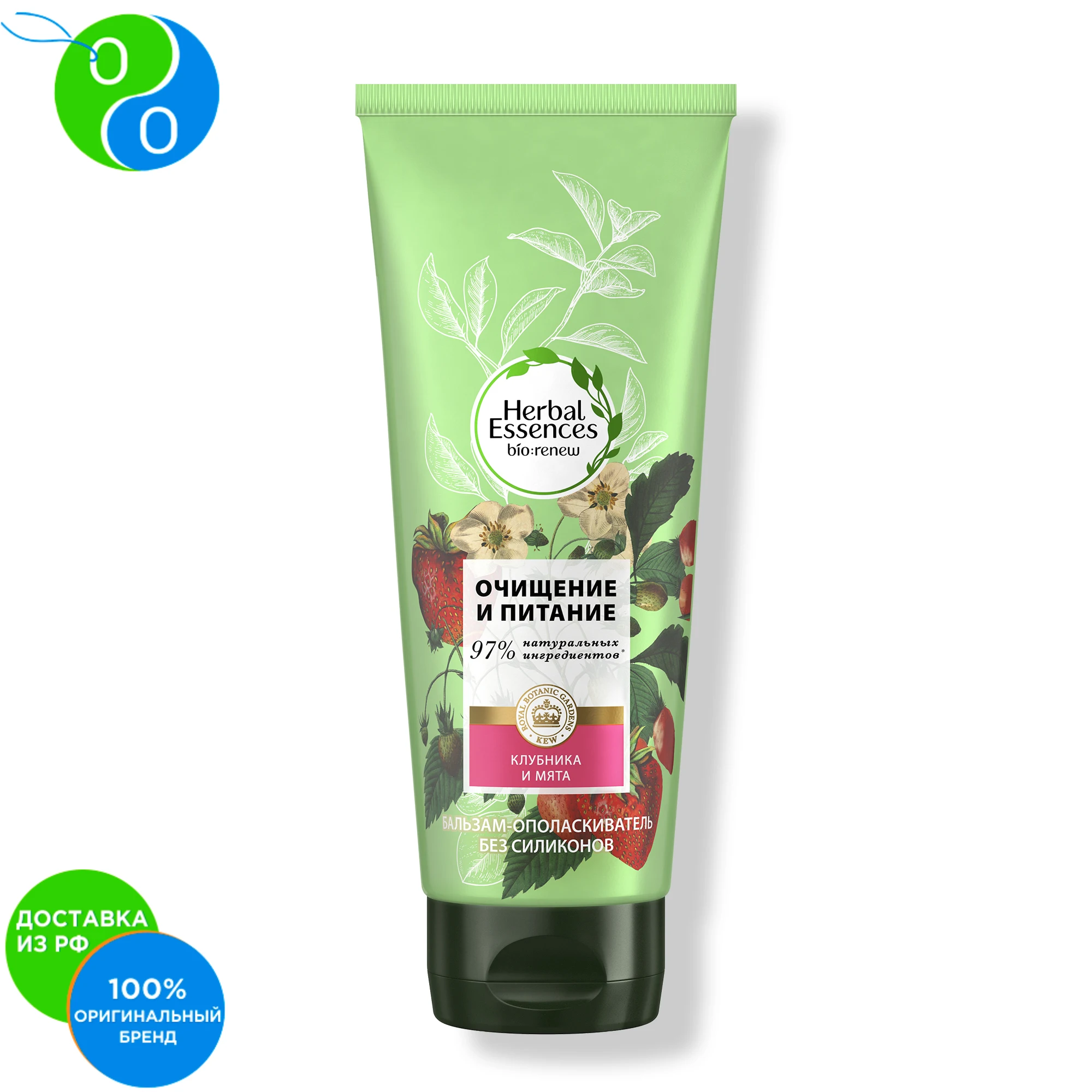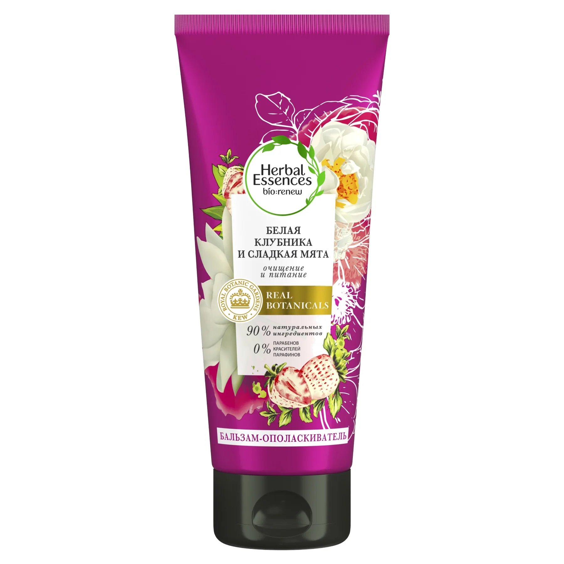 Herbal Essences верит в красоту, вдохновленную самой природой. Теперь мы сотрудничаем с Королевским Ботаническим Садом Кью — всемирно признанным авторитетом в области ботаники, — что удостоверяет качество растительных ингредиентов в наших средствах. Бальзам-ополаскиватель Herbal Essences bio:renew Белая клубника и сладкая мята на 90 % состоит из натуральных ингредиентов* и включает в себя активный антиоксидант, который способствует бережному очищению и защите ваших волос. *очищенная вода и натуральные ингредиенты, прошедшие ограниченную обработку.