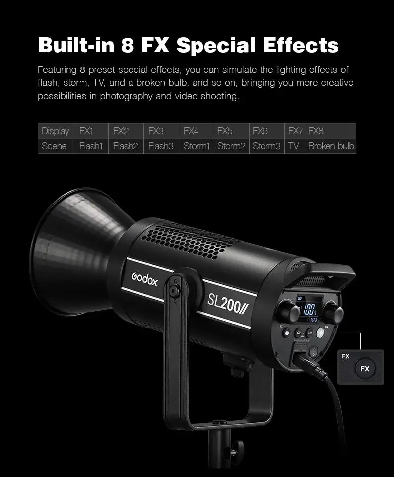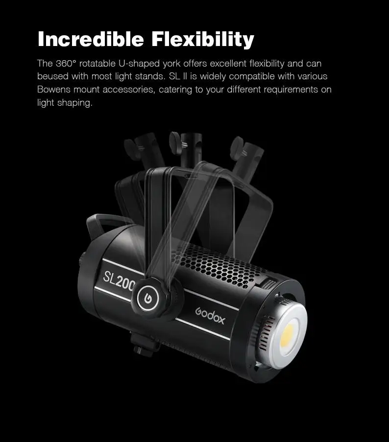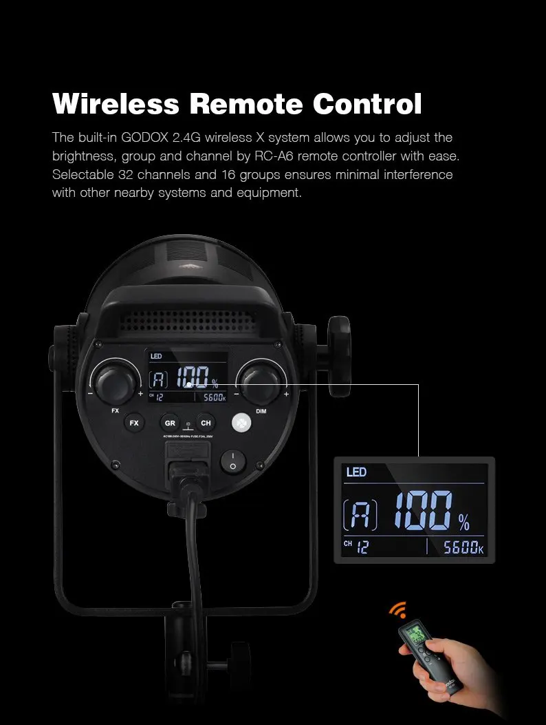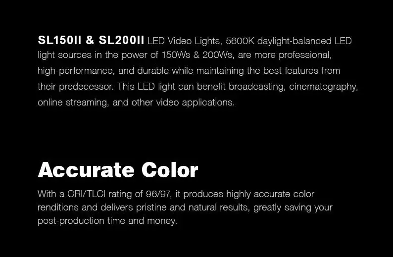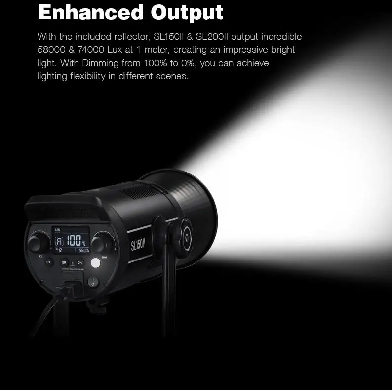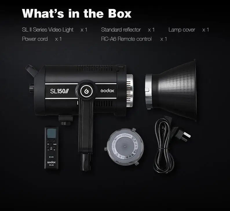 SL150II светодиодный светильник для видеосъемки s, 5600K Дневной светильник-сбалансированный светодиодный светильник мощностью 150WS, более профессиональный, высокопроизводительный и долговечный, сохраняя при этом лучшие характеристики от предисловия. Этот светодиодный светильник может принести пользу broadooasting, кинематографии, онлайн потоковой передачи и других видео приложений Точный цвет С рейтингом CRI/TLCI 96/97, он производит высокоточные цветовые представления и поставляет нетронутые и естественные результаты, что значительно экономит ваше послепроизводственное время и деньги. Улучшенная выходная мощность С включенным отражателем, SL150ll выход невероятный 58000 люкс на 1 метр, создавая впечатляющий яркий светильник. С затемнением от 100% до 0%, вы можете достичь гибкости освещения в различных сценах. Бесшумный режим Ошеломляющая система рассеивания тепла и ультра Тихая конструкция позволяют SL II поддерживать незначительный шум во время работы. Он идеально подходит для чувствительных к звуку сред, так как вы можете выключить вентилятор одним нажатием кнопки бесшумного режима для устранения шума во время использования. Невероятная гибкость Вращающаяся на 360 ° u-образная форма york обеспечивает отличную гибкость и может использоваться с большинством стоянок под светильник. SL Il широко совместим с различными аксессуарами для крепления Bowens, адаптируясь к вашим различным требованиям на светильник. Встроенные специальные эффекты 8 FX с 8 предустановленными специальными эффектами, вы можете имитировать световые эффекты вспышки, шторма, телевизора и сломанной лампы и так далее, приносим вам больше творческих возможностей в фотографии и видеосъемке. Беспроводной пульт дистанционного управления Встроенная беспроводная система GODOX 2,4G X позволяет легко регулировать яркость, группу и канал с помощью RC-A6 пульта дистанционного управления. Выбор 32 каналов и 16 групп обеспечивает минимальное взаимодействие с другими соседними системами и оборудованием.