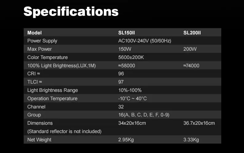 Бренд: Godox Модель: SL150WII Цветовая температура: 5600K ± 200K Мощность (макс.): 150 Вт Источник питания: AC100V-240V (50/60 Гц) Канал: 32 Группы: 16(A,B,C,D,E,F,0-9) 100% светильник с яркостью (люкс, 1 м): 58000(1 м) CRI = 96 TLCI = 97 Светильник диапазон яркости: 10% ~ 100% Рабочая температура: -10 °C ~ 40 °C. Размер посылка: 34*20*16 см Вес посылки: 2,95 кг