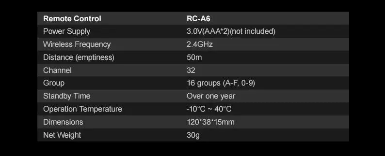 Источник питания: 3,0 в 2 * AAA (не входит в комплект) Беспроводная Частота: 2,4 ГГц Расстояние управления: ≥ 20 м Канал: 32 Пульт дистанционного управления: 16(A,B,C,D,E,F,0-9)