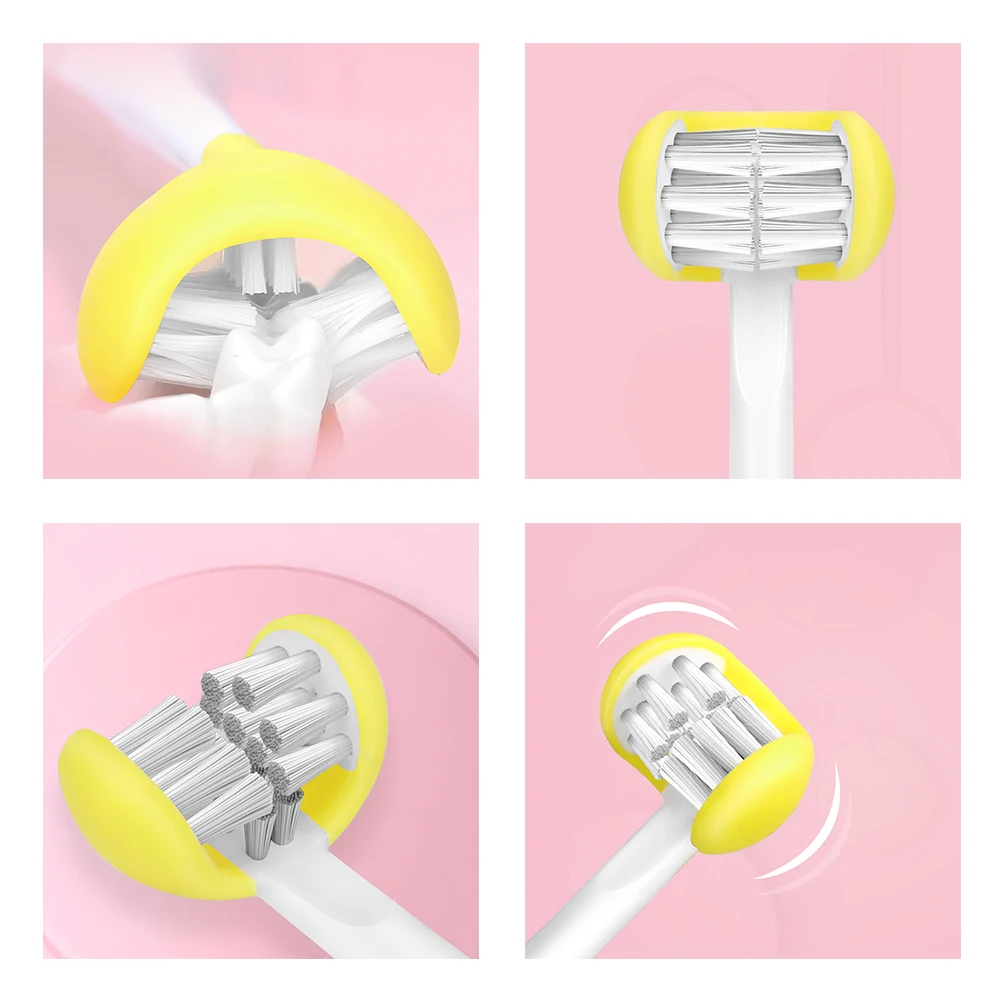 【 U-образная головка & Мягкий Bristles】The u-образная Головка сделана из резиновое покрытие и зубная щетка из нейлона Dupont мягкие щетинки зубной щетки. Резиновое покрытие может защитить нежной детской зуба от того, что в разобранном виде по насадка для зубной щетки. И мягкие щетинки зубной щетки сочетает в себе u-образный дизайн может придаст Вашему ребенку легко между зубами, щеточка для зубов, множество цветов на во всех направлениях без мертвого Уггла.