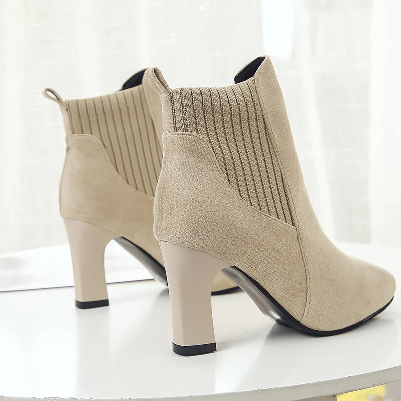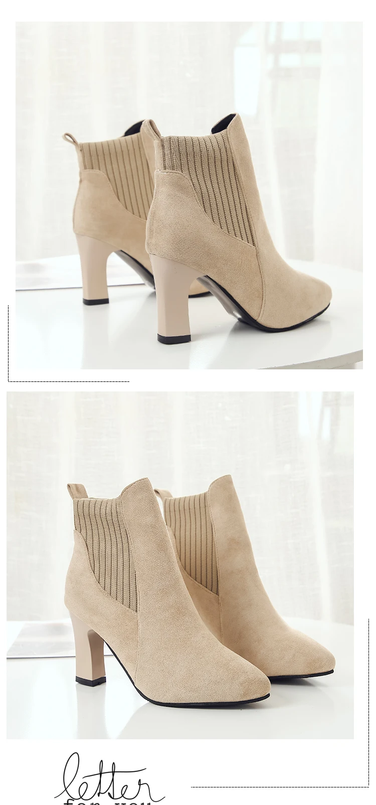 Замшевые женские ботинки; Эластичные трикотажные полусапожки из флока; С заостренным носком, модные зимние ботинки; Женские ботильоны без застежки на высоком каблуке
