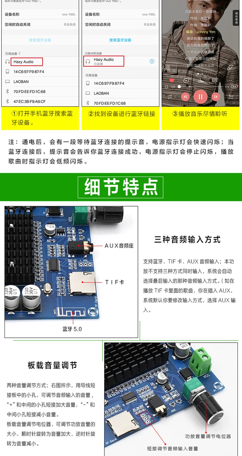 TDA7498 Плата усилителя мощности bluetooth, с использованием оригинальной установки импортного чипа усилителя мощности, обладает высоким качеством стереозвука; Поддержка bluetooth, карты TIF, AUX вход аудио, конфигурация усилителя мощности bluetooth 5,0 Высокоскоростная передача, поддержка музыкальных форматов APE, FLAC, MP3, WAV, WMA, Например, музыкальный формат может быть декодирован на основном рынке, до тех пор, пока на мобильный телефон может воспроизводиться этот bluetooth, не влияет на расстояние не будет caton. Bluetooth эффективная передача на расстоянии 20 метров беспрепятственное соединение, но в соответствии с персональной конфигурацией телефона bluetooth сила сигнала отличается, расстояние передачи будет разрывом. Усилитель мощности Входная мощность на DC12-30 в, имеют двойной звуковой выход канала, выходное сопротивление составляет 4-82, максимальная мощность 100 w2; Бортовой потенциометр громкости, свободны для регулировки громкости.