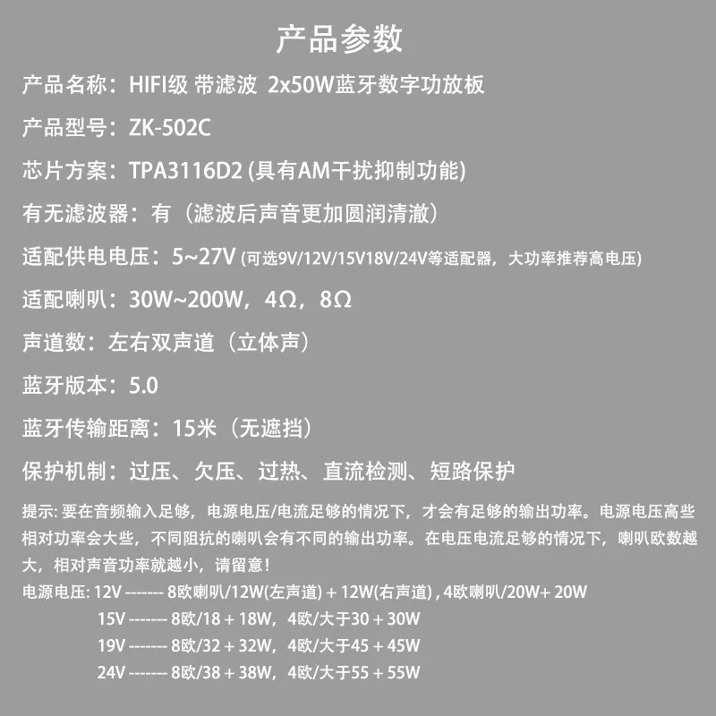 Название продукта: ленточный фильтр HIF1 2x50 Вт, плата цифрового усилителя мощности bluetooth Модель продукта: ZK - 502 - cChip: TPA3116D2 (Функция подавления помех AM) Есть ли фильтр: таким образом, звук более фруктовый и чистый после адаптера (фильтра) напряжение источника питания: 5-27 в (Дополнительный адаптер 15 в 18 в/9 В/12 В/24 В, такой как высокая мощность для рекомендуемого высокого напряжения) подходит для гудка: 30-200 Вт, 4 в, 80 о трек-номер: двухканальная (стерео) Версия Bluetooth: 5,0 расстояние передачи Bluetooth: 15 метров (без) защитный механизм, перенапряжение, пониженное напряжение, Перегрев, тестирование постоянного тока, защита от короткого замыкания совет: для аудиовхода достаточно, напряжение/ток источника питания при достаточном состоянии, просто может иметь достаточно выходной мощности, высокое напряжение, когда относительная мощность будет больше, разные динамики имеют разное сопротивление выходной мощности, достаточное напряжение тока, рог Европы для Америки, Чем меньше относительно Звуковая мощность, обратите внимание! Напряжение источника питания: 12. Ming (левый звуковой канал) + 12 Вт/12 Вт (правый звуковой канал), 4 ЕС/20 Вт + 20 Вт 5 В .. / 18 18, 4 o/более 30 + 30 w19 +.8/32 × 32 Вт, 4/F45 × 45W24 8/38 + W,4 o/более 55 + 55 Вт