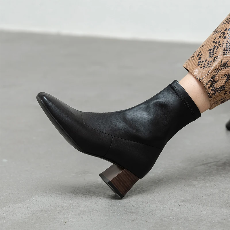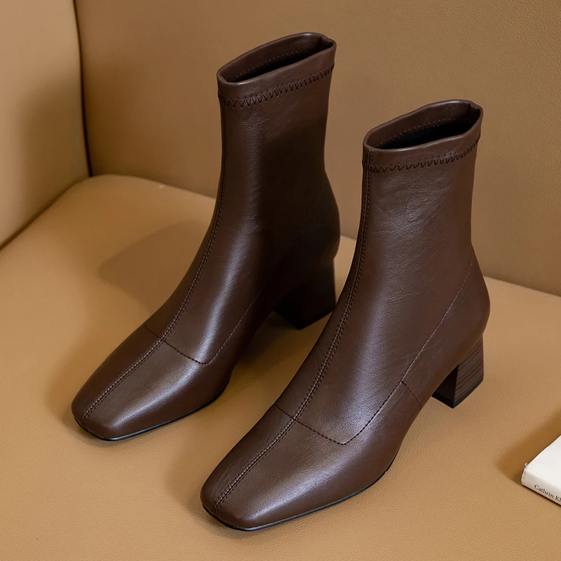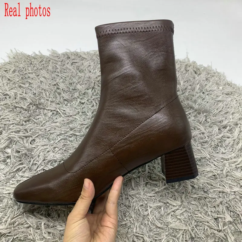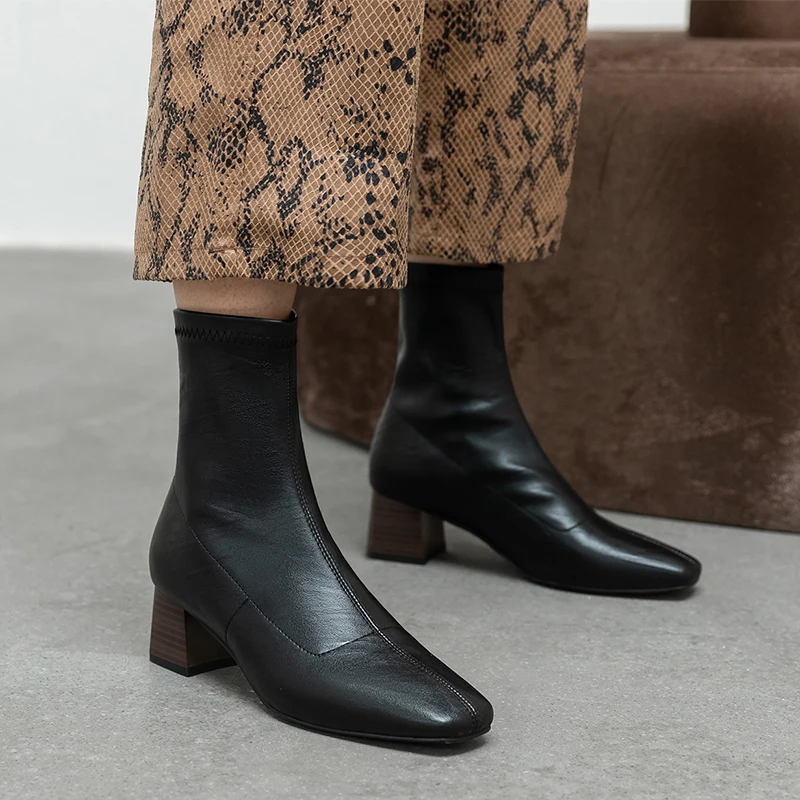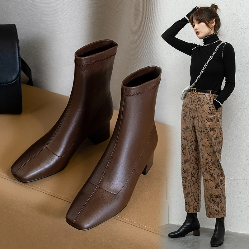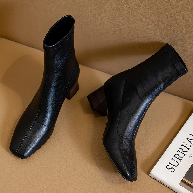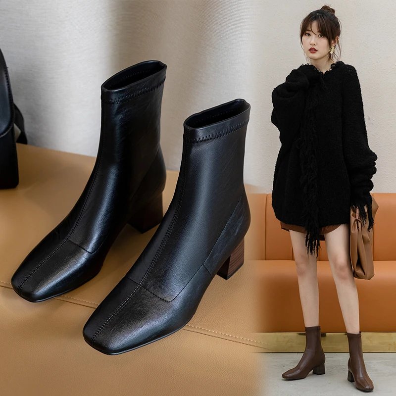 Женские короткие ботильоны из натуральной кожи, зимние теплые ботинки челси с квадратным носком, танцевальные туфли на высоком каблуке