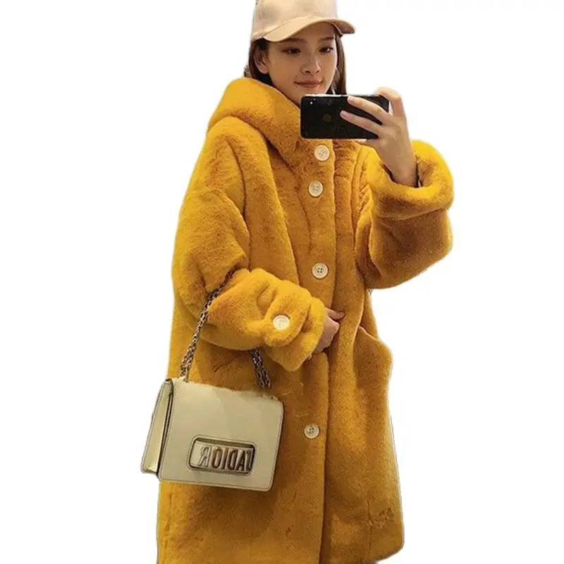 Женское пальто из искусственного меха, повседневные корейские толстовки с капюшоном, пушистая теплая длинная куртка из искусственного кроличьего меха с рукавом летучая мышь, свободное зимнее пальто для женщин, 2022
