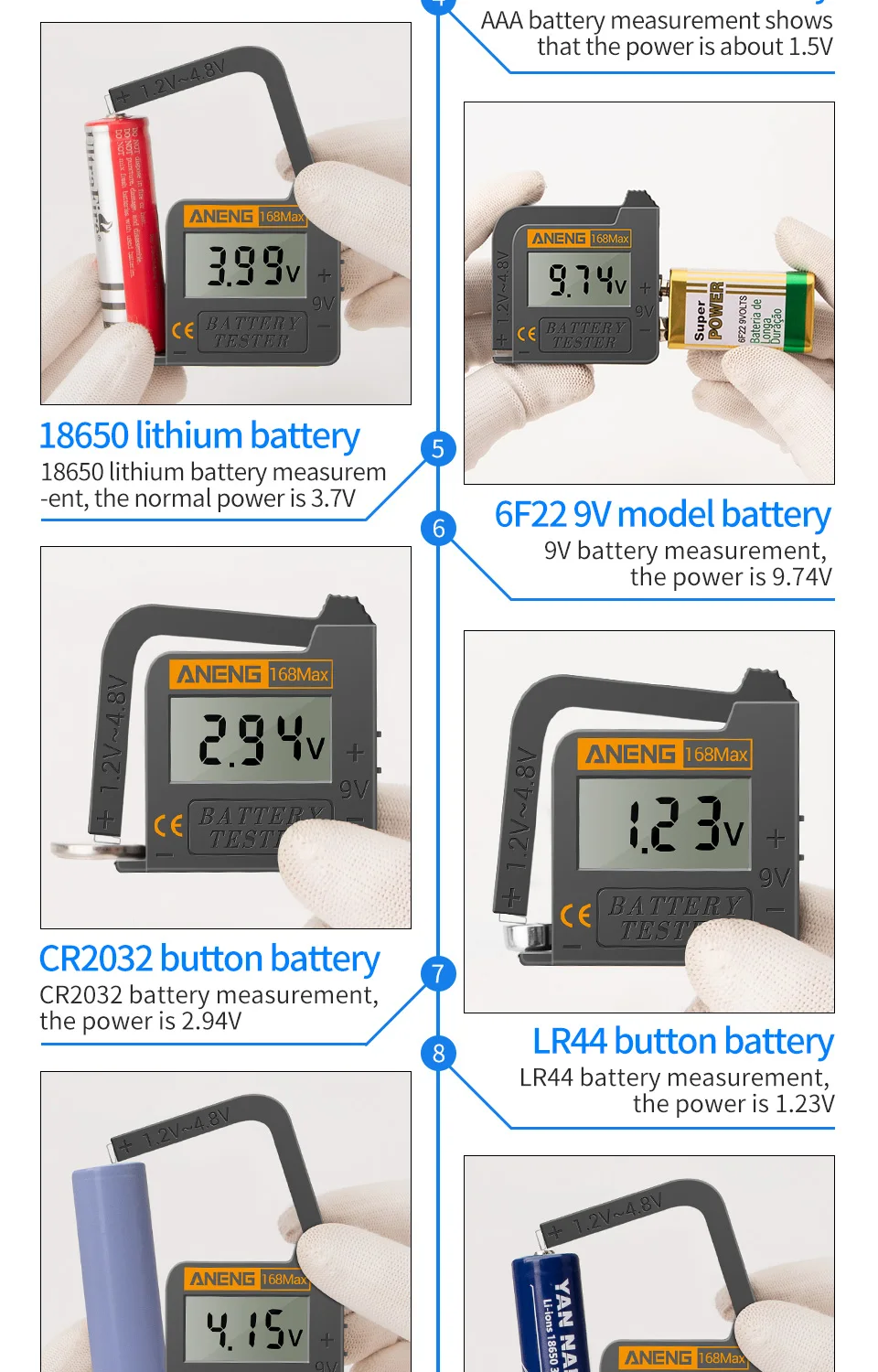 Цифровой анализатор емкости литиевых батарей ANENG 168Max, универсальный тестовый клетчатый анализатор нагрузки, дисплей, проверка кнопок AAA AA