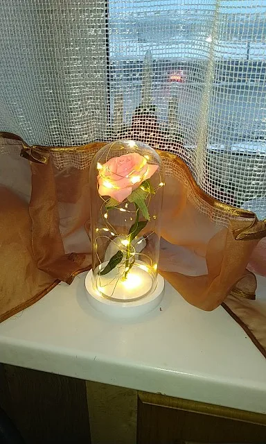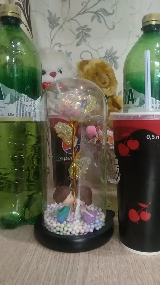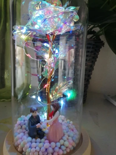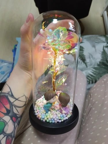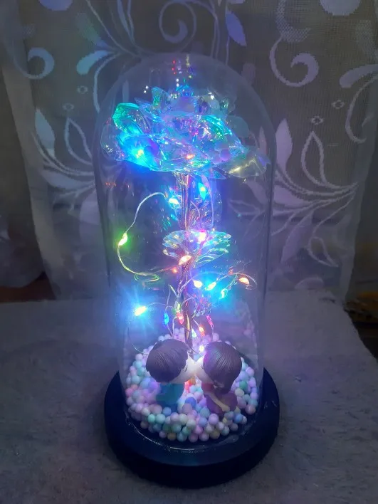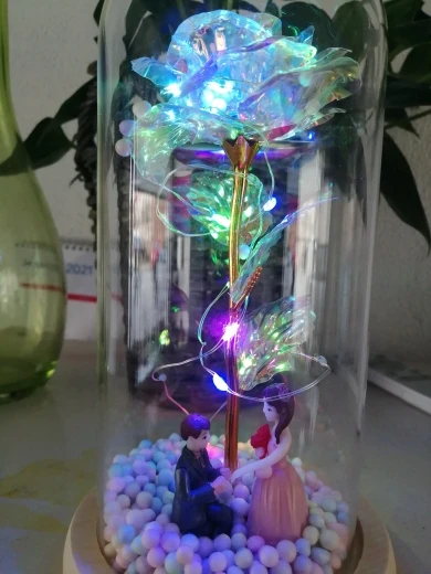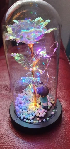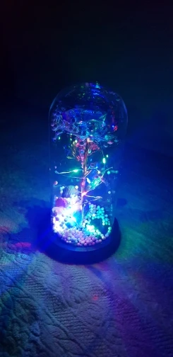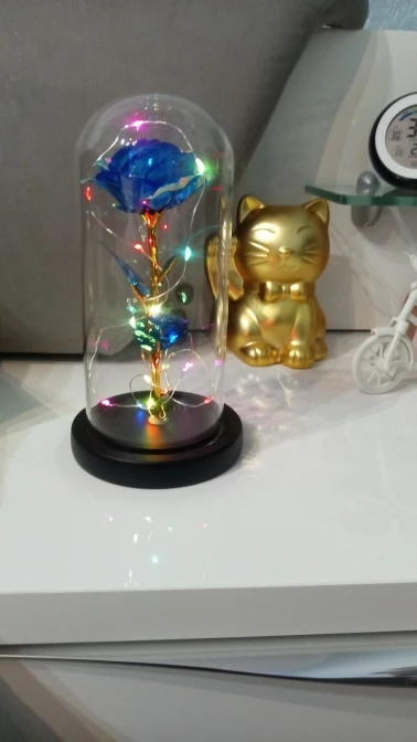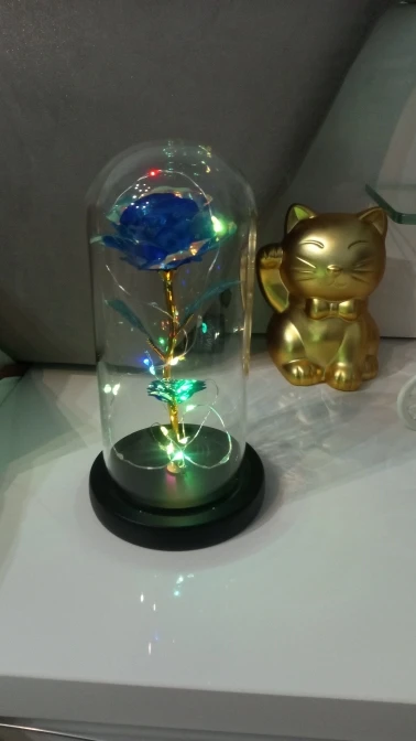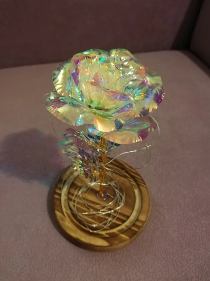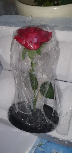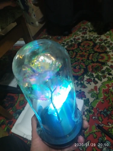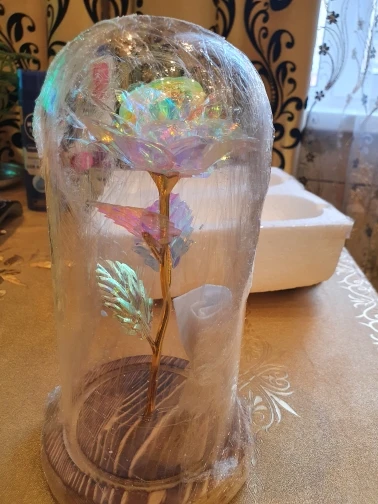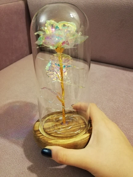 Описание товара достаточно точное, кроме одной детали: гирлянда неисправна (не горит). Либо лично мне так повезло. Это очень досадно, потому что приобретала в подарок. Однако, хочу заметить, что и без подсветки Роза выглядит очень достоино. Сама роза, подставка и купол выполнены на совесть. Удивлена, что стеклянный купол при транспортировке не треснул. Упаковано все было качественно. Но вот гирлянда очень подвела...