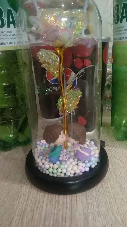 достойно! не знаю, чем многие не довольны. мне понравилось ) сама банка стеклянная . роза красивая. светодиоды в одном режиме сверкают меняя цвета . батареек в комплекте нету. понадобилось 3 мезинчековые . кстати внутри все напутано и где написано - , там должен быть + )) не знаю во всех так или только у меня. я уж решила, что светильник не работает . упаковано было очень хорошо. при желании не разбить. доставка быстрая !