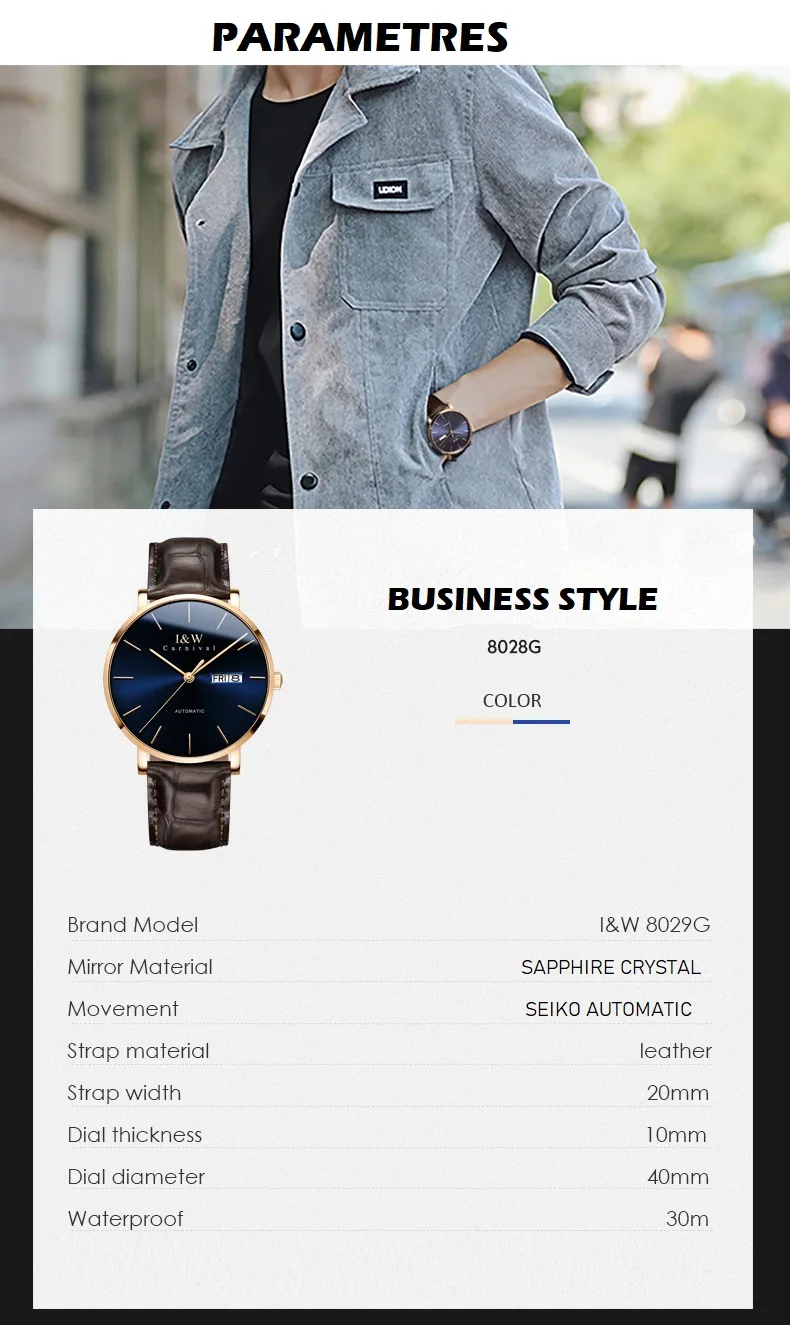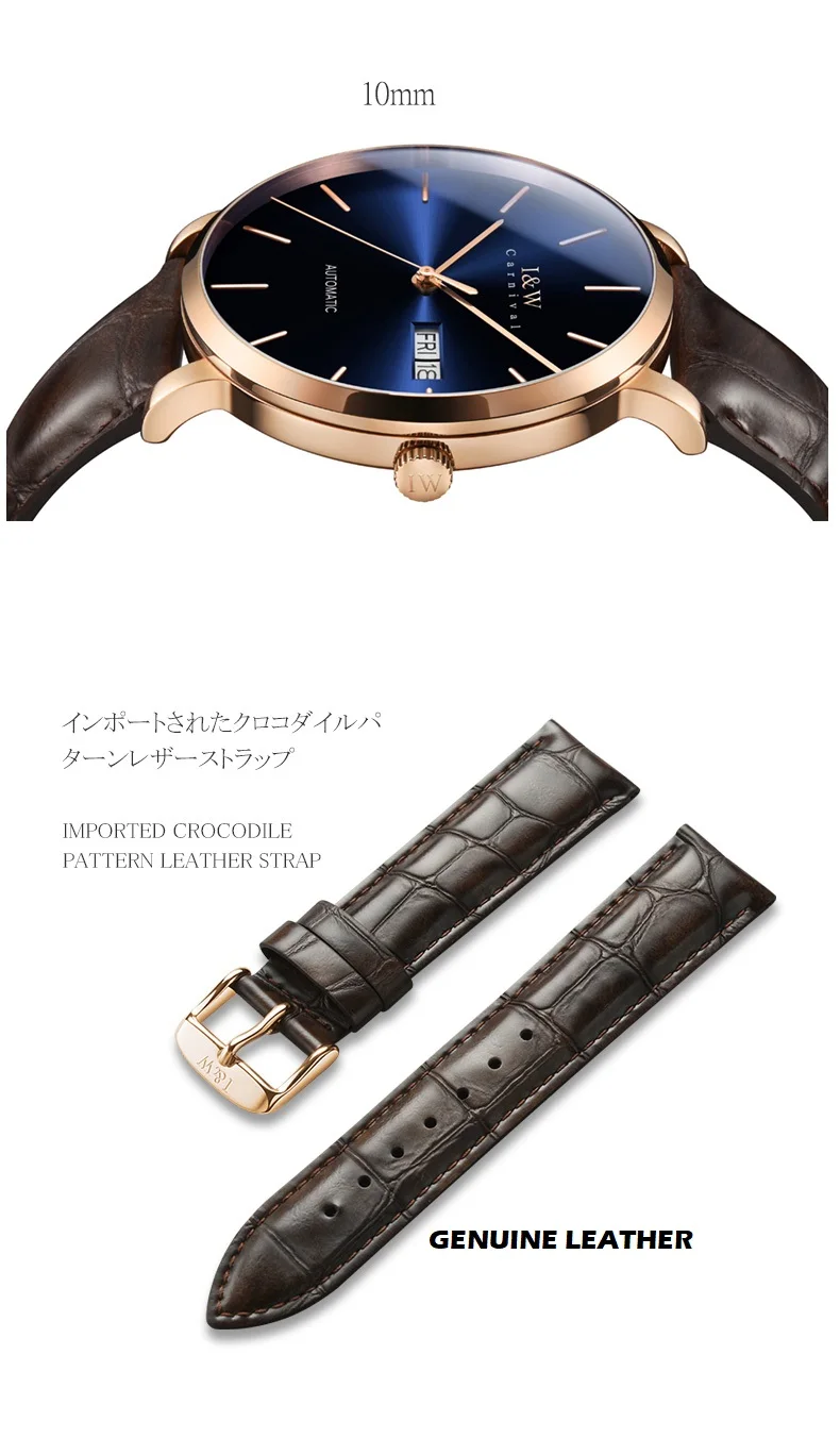 Бренд: CarnivalОсобенности: Водонепроницаемость, точное время, отображение недели, отображение календаряМеханизм: механический механизм NH36AКатегории часов: мужскиеМатериал корпуса: нержавеющая стальМатериал ремешка: кожаДлина Часов: около 220 ммДиаметр Dail: около 40 ммШирина ремешка: около 20 ммDail Толщина: около 10 ммПосылка: простая Подарочная коробка, многоязычное Руководство пользователя, гарантийный талон и оригинальное производство(Размер измеряется вручную, возможна погрешность в 1-3 см, только для справки. Пожалуйста, поймите)