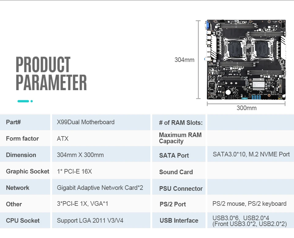 Поддержка LGA 2011-V3 / V4 полный Процессор серии8 * DDR4 RAM слот, поддержка 2133/2400 MHz Dual CPU 8-канальная архитектура до 256GBБортовой высокоскоростной интерфейс NVMe M.2Двойной гигабитный EthernetДисплей отладки с двумя цифрами10 * SATA3.0