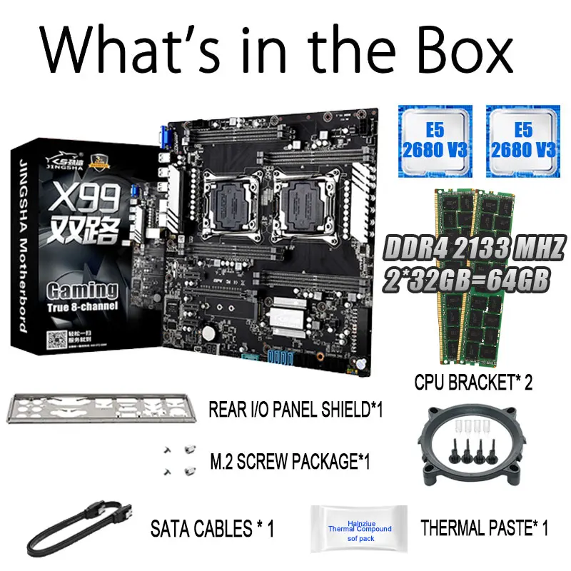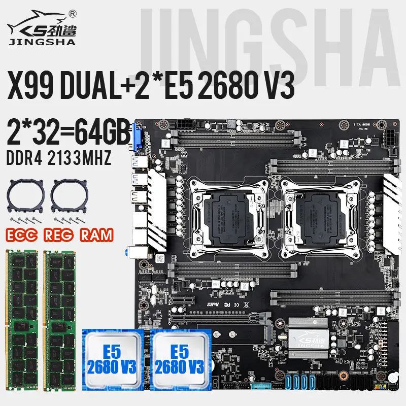 Комплект материнской платы X99Dual с 2 шт. E5 2680V3 2,5 ГГц 12 ядер и 2 шт. 32 Гб DDR4 2133 МГц ECC REG RAM