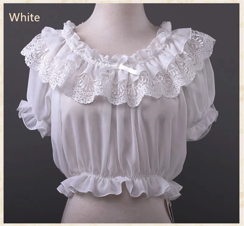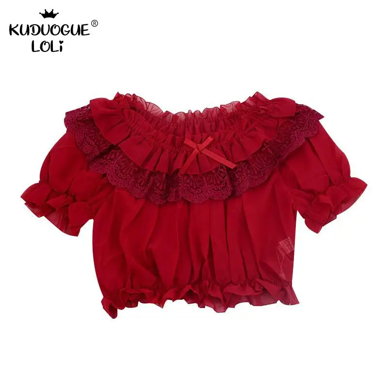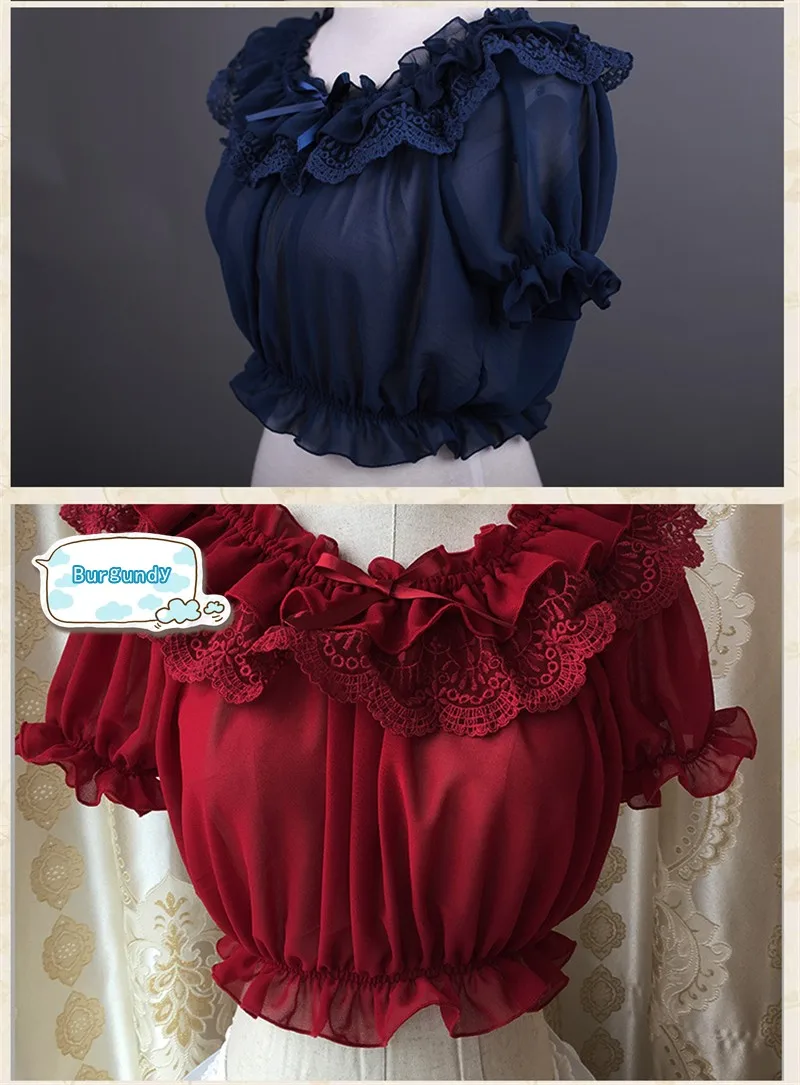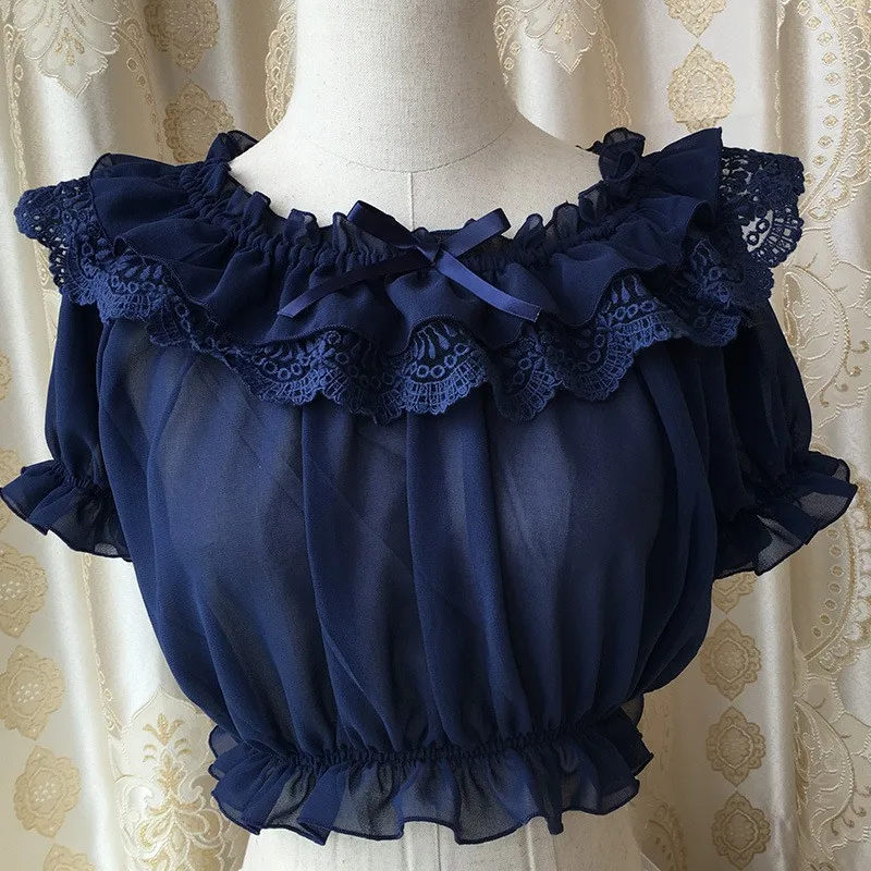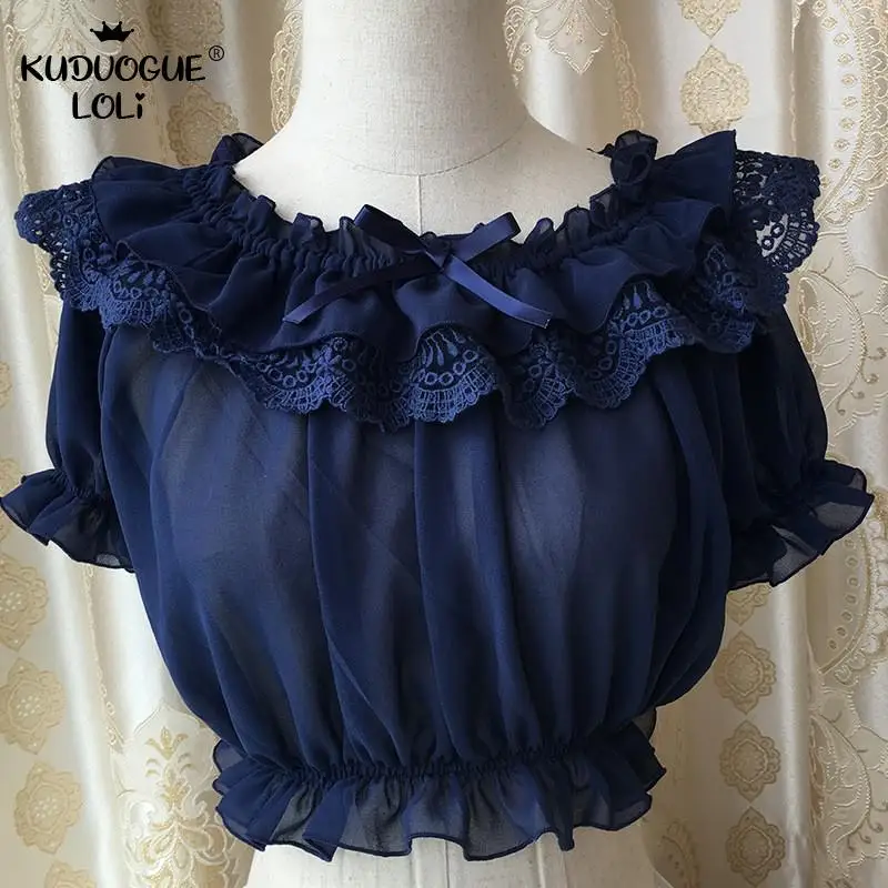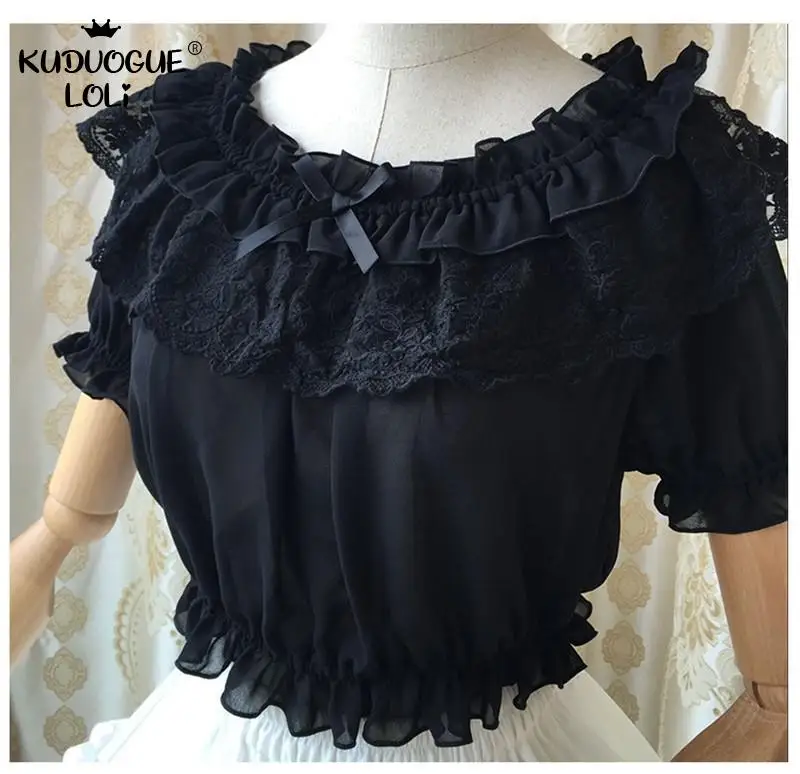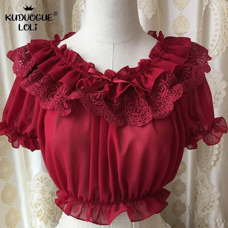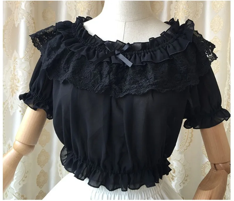 Укороченные топы в стиле "Лолита", рубашка для девочек, милая шифоновая блузка с открытыми плечами и коротким рукавом, кружевные оборки, винтажный женский элегантный готический эластичный Топ с бантом